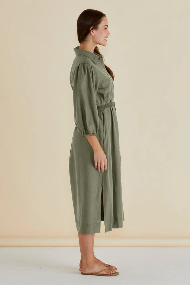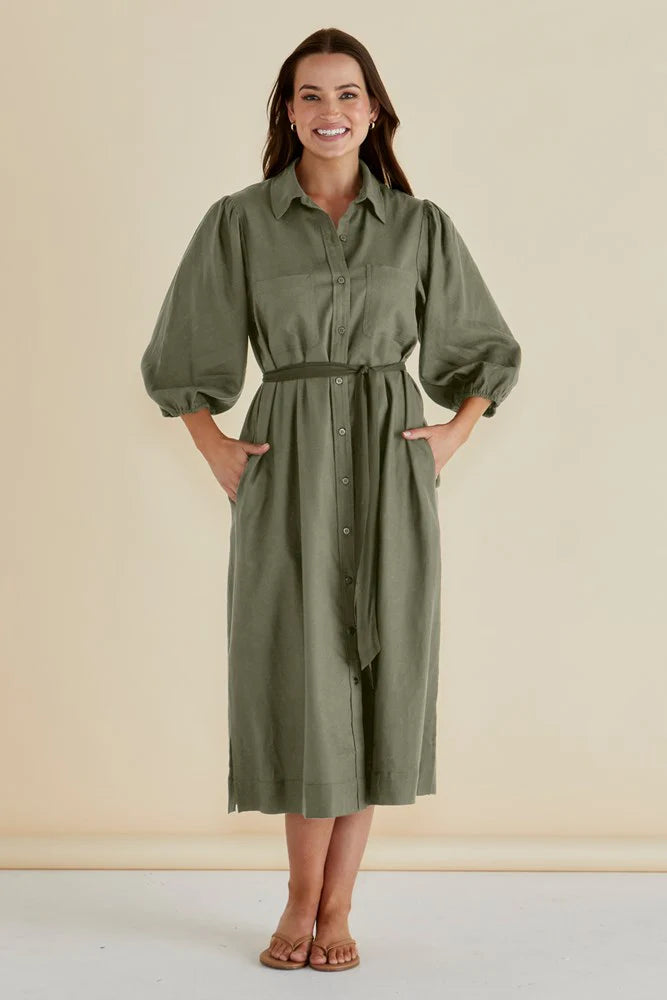 The Angelina Dress is a refined choice for the modern woman, crafted in a viscose blend that feels soft and comfortable. Its billowing sleeves and detachable waist tie create an elevated, classic silhouette. The button-up front and relaxed fit make it an effortless transeasonal staple that exudes sophistication and ease.