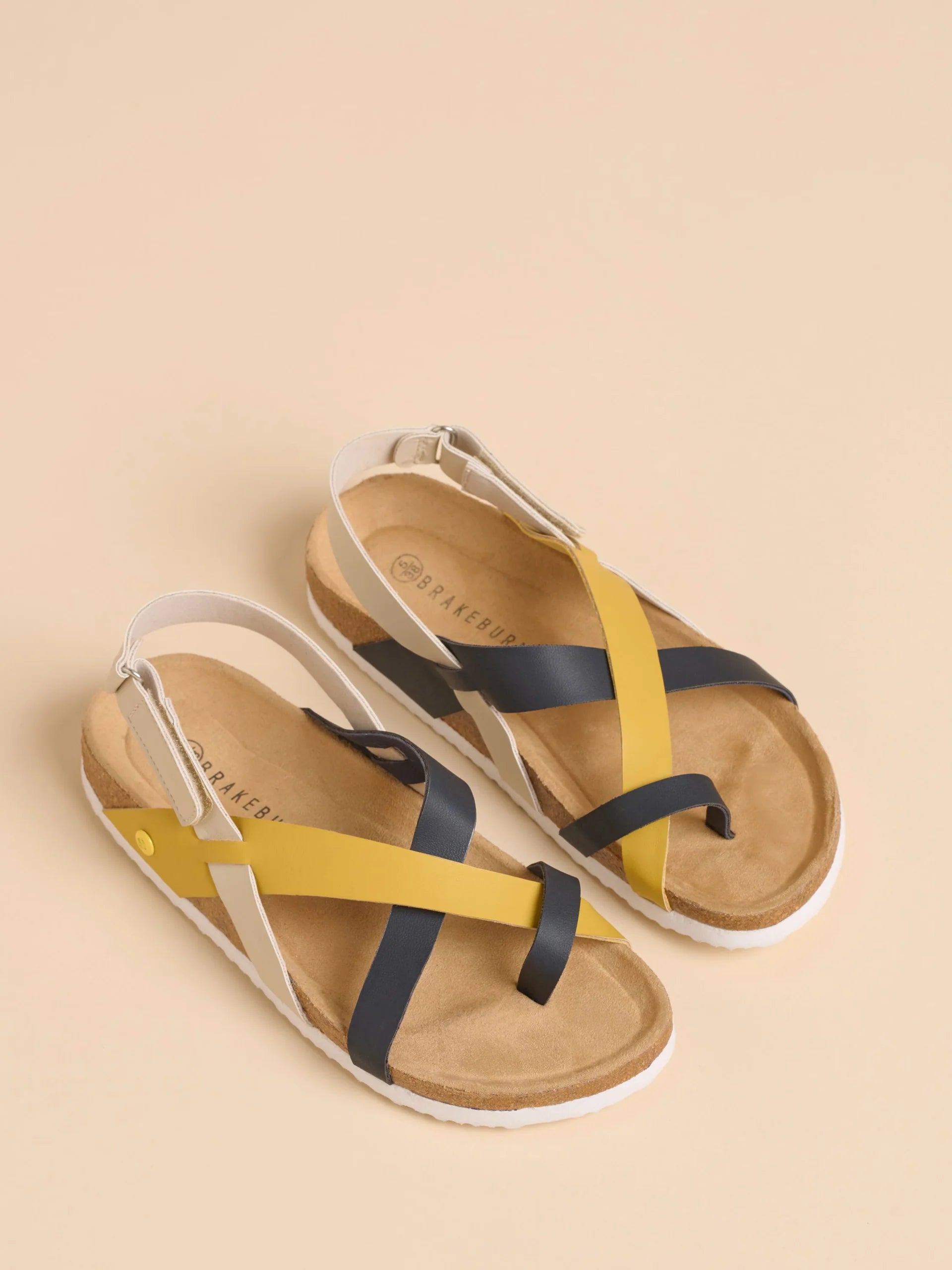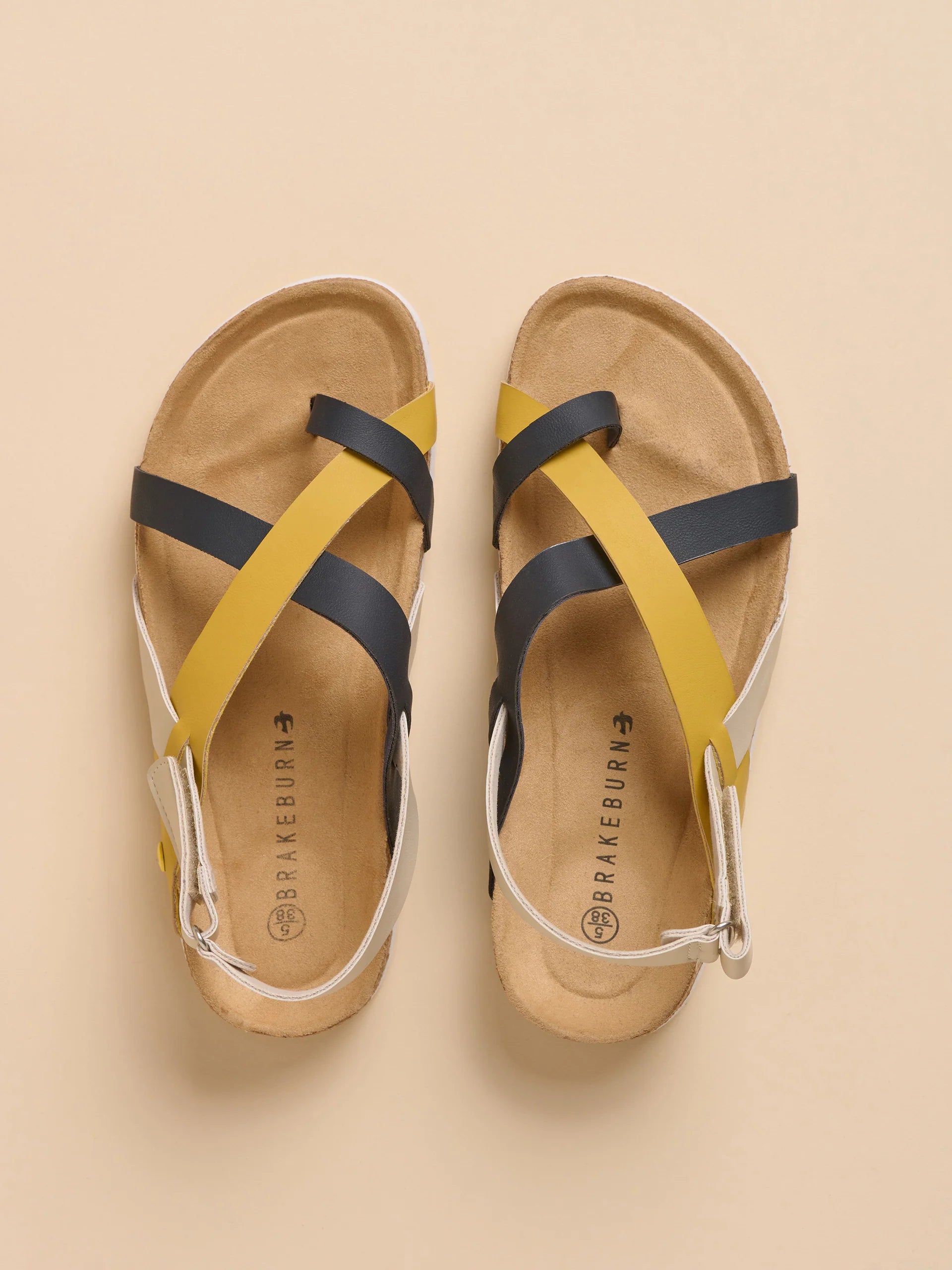 Walk on sunshine in these gorgeous sandals. With multi-colour faux leather straps in mustard, white, and black crossing over the big toe and foot, they are as versatile as they are comfortable. An adjustable Velcro ankle strap and moulded cork footbed will keep your feet happy all day.