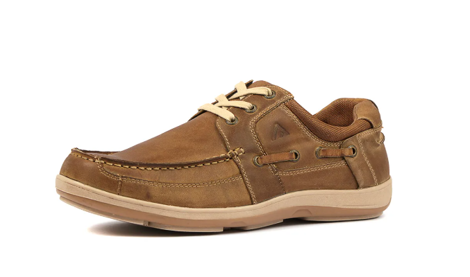 This shoe features a breathable leather upper which moulds to your foot and will provide further comfort with each wear. The Mocc Vamp construction is hand-stitched to improve comfort and offer a better fit. The herringbone razor cut outsole tread provides enhanced anti-slip resistance.