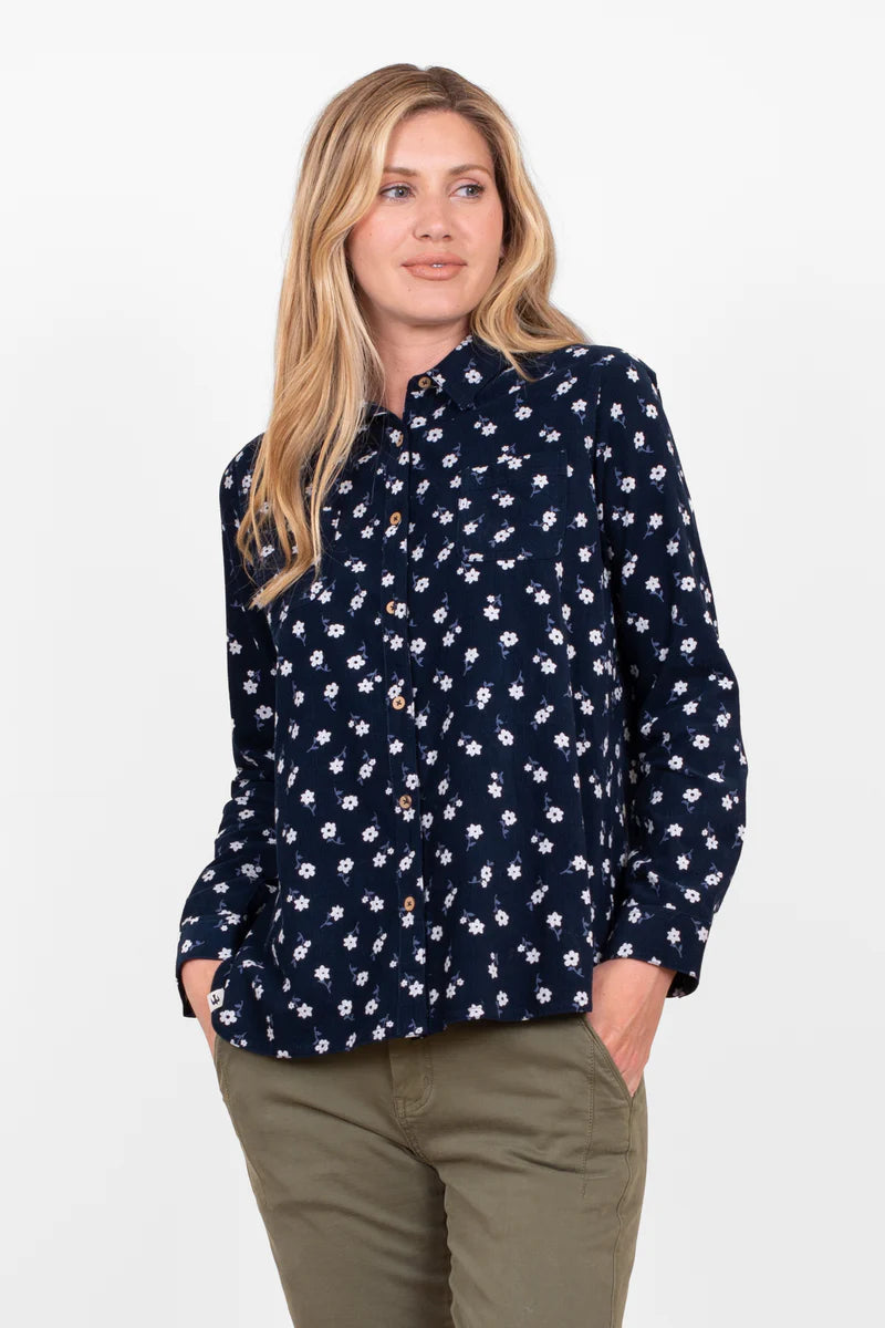 Prepare for an onslaught of admirers in this daisy patterned cord shirt! Made from soft, breathable cotton cord, this button-up shirt is great for this seasons wardrobe. With the dipped hem it could be worn with a multitude of different trousers for many different looks. Also featuring two front pockets, long sleeves, and wood-effect buttons.