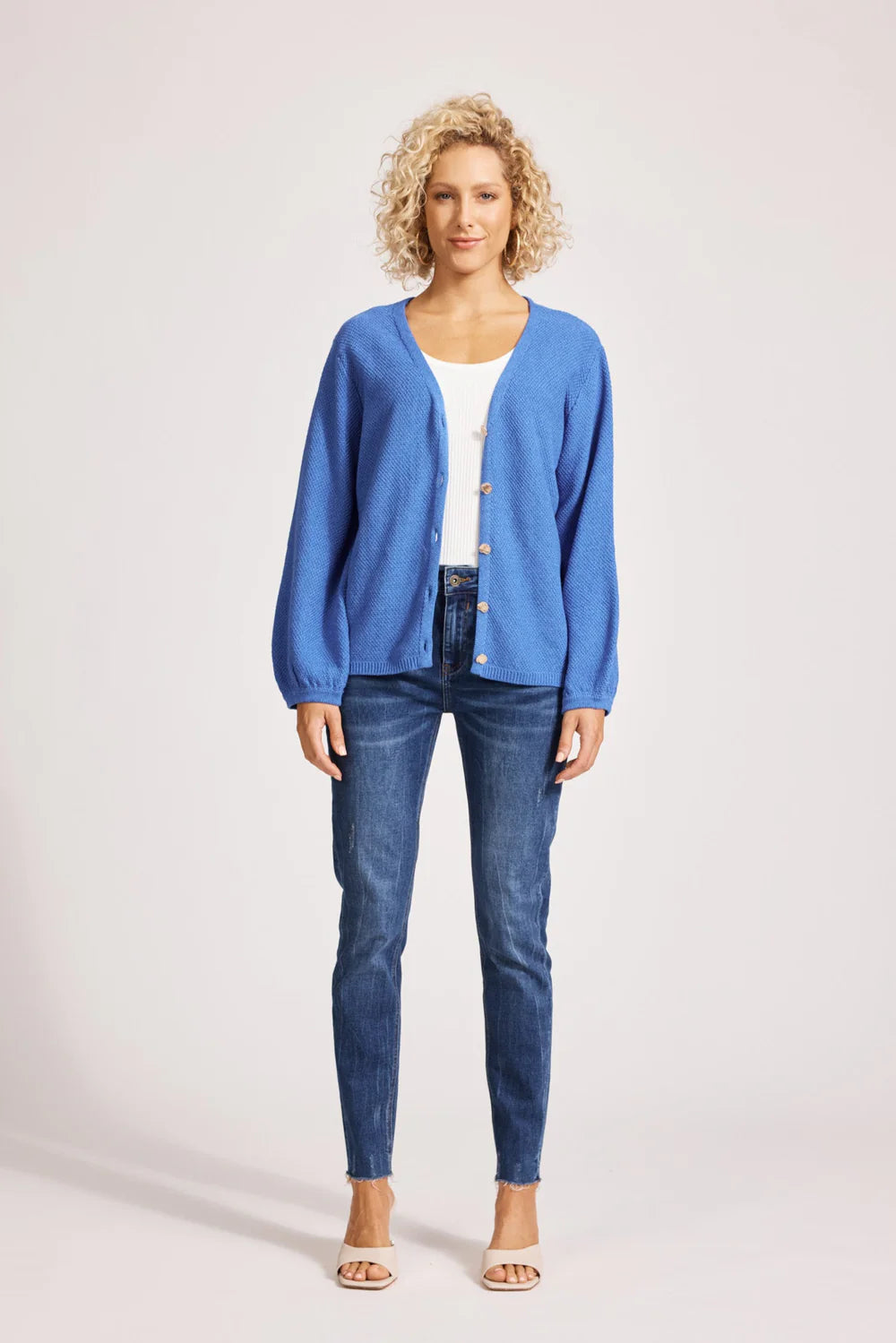 A soft waffle knit cardigan, crafted from 100% cotton. This knit is perfect for layering. Featuring gold button detailing, curved long sleeves, and ribbed cuffs.