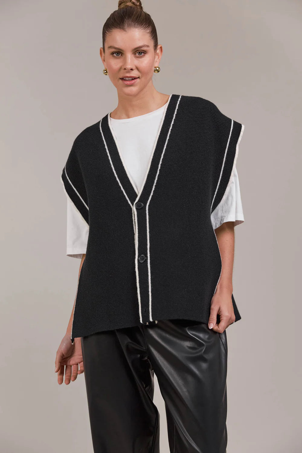 Meet your new vest friend. Perfect for layering, the Avino Knit Vest will transform your cool-weather wardrobe. With a sleek, modern silhouette, this distinctive piece features a deep V-neck, a button-through front, and striking contrast detailing that adds intrigue to the design. The buttoned vents on each side let you adjust the fit, creating a tailored shape that complements whatever you layer beneath.