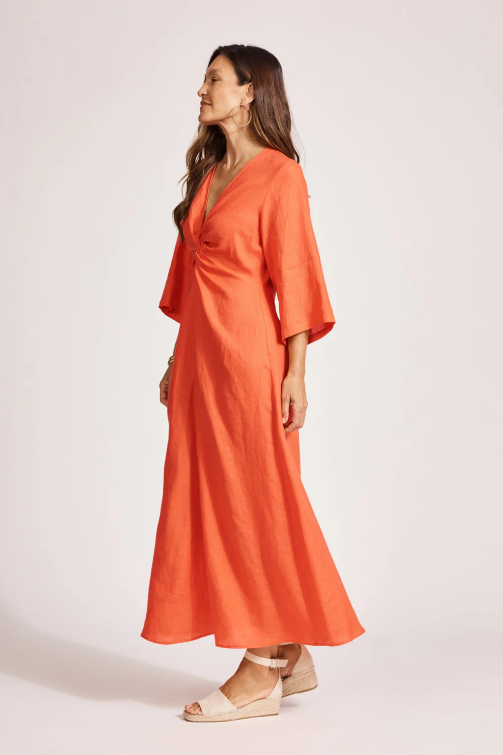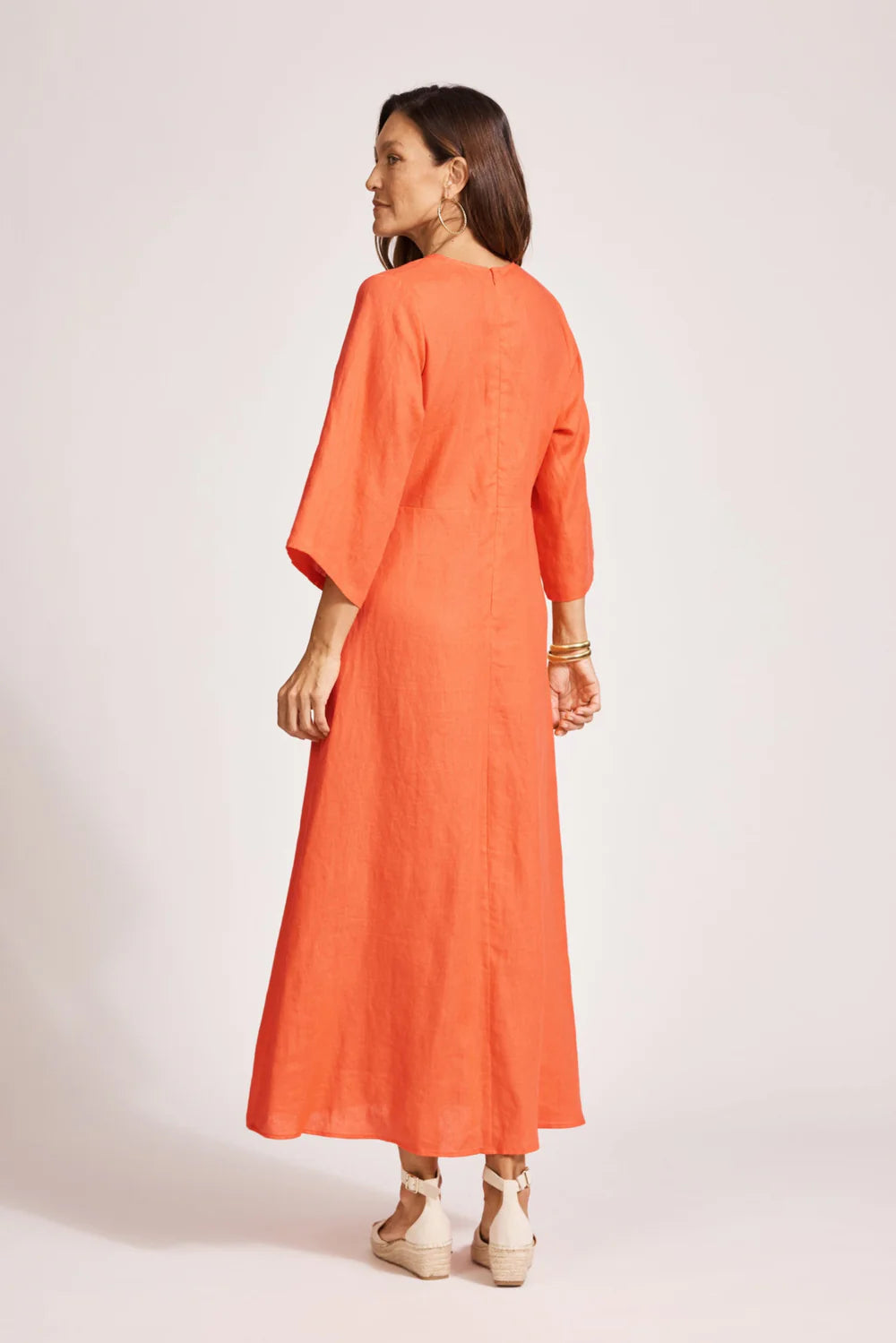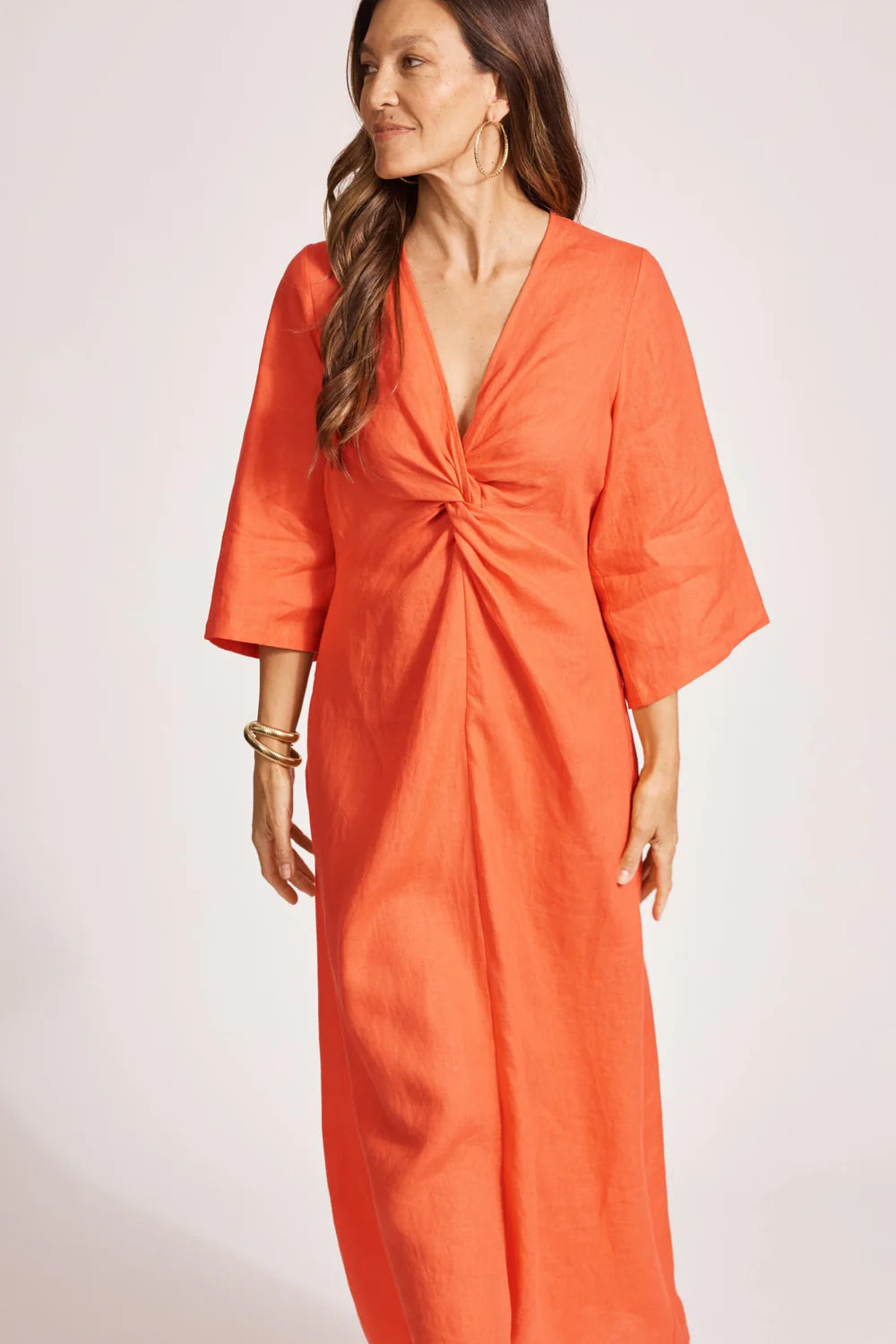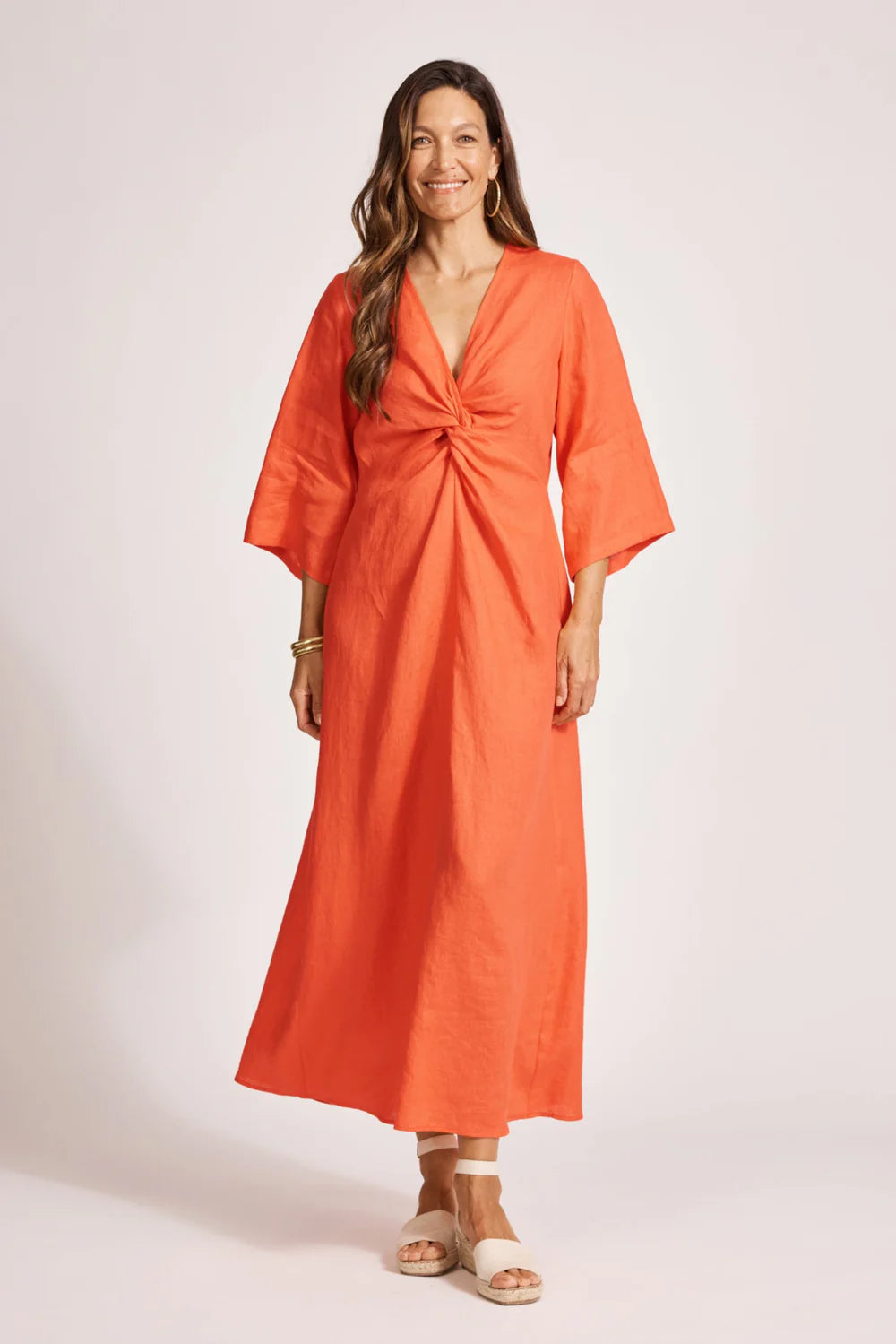 A show-stopping linen maxi designed for elegant summer dressing. Crafted from 100% linen for breathability. Features a fixed twist detail at the front to contour the waist, V neckline with hook-and-eye closure option, and mid-length relaxed sleeves.