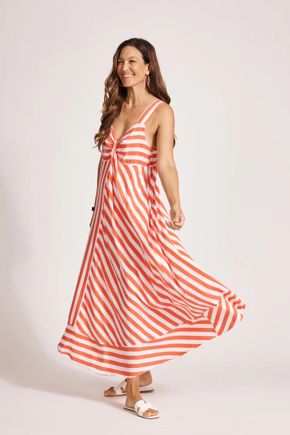 A show-stopping striped maxi. Made from soft washed rayon for effortless drape. Features a fixed tie at the chest for shape, wide shoulder straps to conceal undergarments, concealed elastic at the back for comfort, and side zip closure. Finished with a contrast stripe panel at the hem.