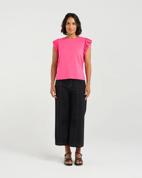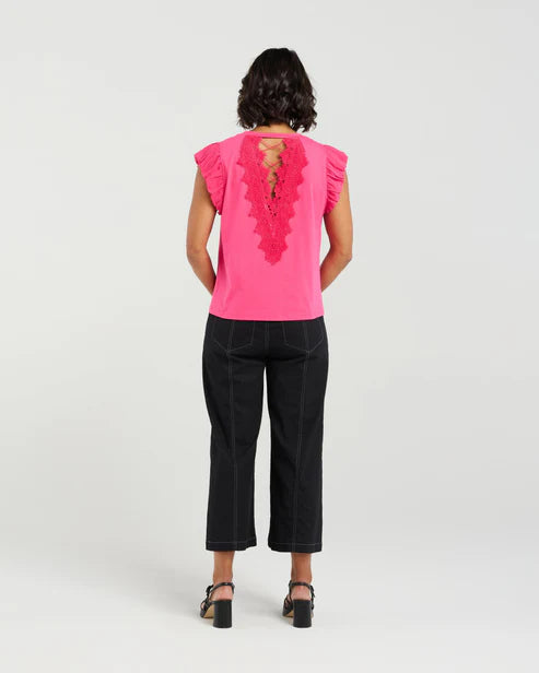 This elevated tee redefines everyday ease with a touch of unexpected elegance. Cut in a refined silhouette from a soft, premium cotton blend, it features a striking lace panel at the centre back—adding a layer of delicate texture and feminine contrast. The clean front keeps the look understated, while the intricate lace detail offers a moment of surprise and sophistication from behind. Effortless from every angle.
