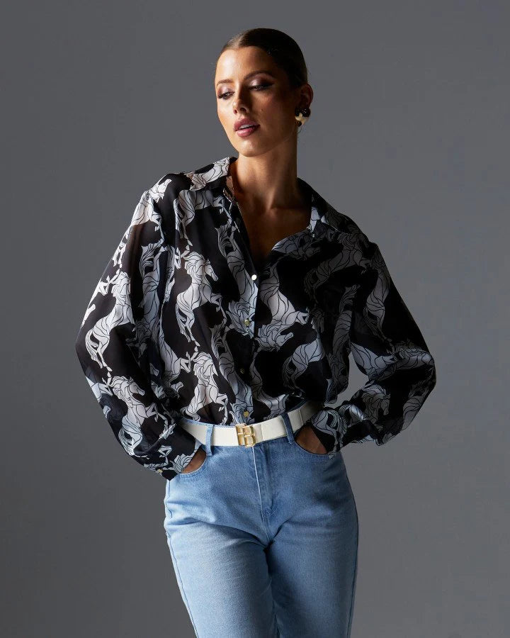 Meet your new wardrobe essential: the Perfect Match Shirt. This regular fit collared shirt features a fixed opening neckline and long sleeves, adorned with a front gold button closure. Effortlessly versatile and undeniably chic, the Perfect Match Shirt is the epitome of refined elegance.