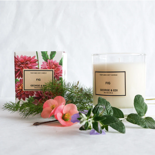 George & Edi candles are hand poured and made in their Wanaka atelier, and crafted from natural soy wax with cotton braided wicks. They are wrapped in signature, hand drawn botanical paper.