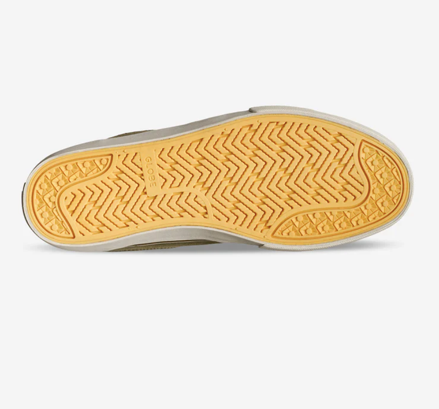 The Mahalo Plus in Khaki/Antique is Mark Appleyard's classic vulcanized skate silhouette with added rubber ollie patch for durability. Just like the original Mahalo the Mahalo Plus also features Globe's Shockbed™ insole for impact control specifically formulated for Mark and Super-V™ outsole for enhanced grip and board feel.