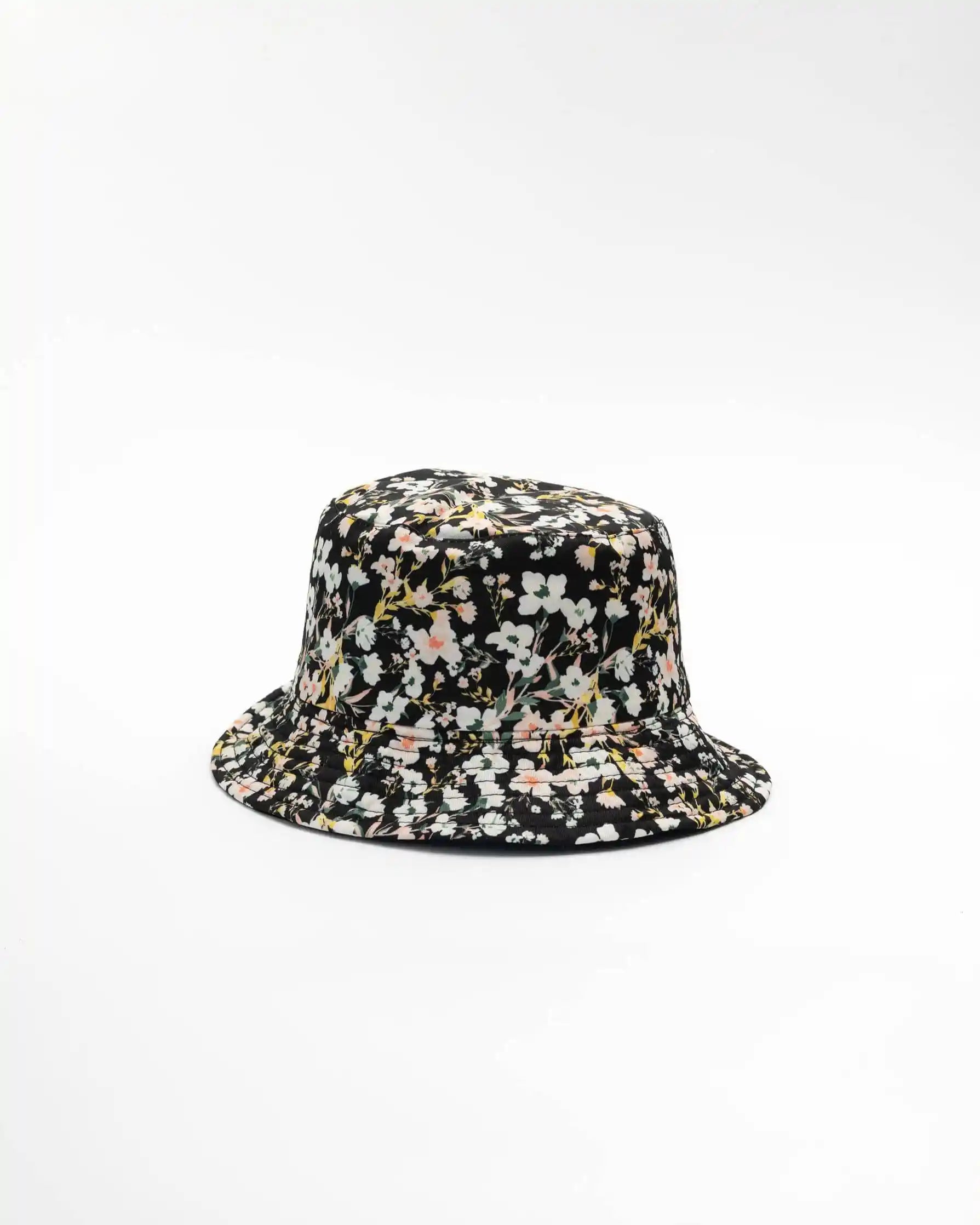Reversible bucket hat with floral print on one side and black on the reverse side