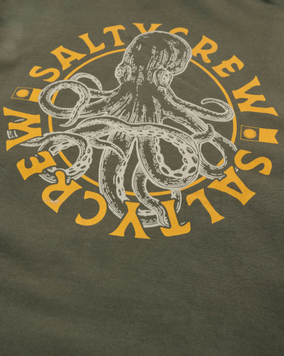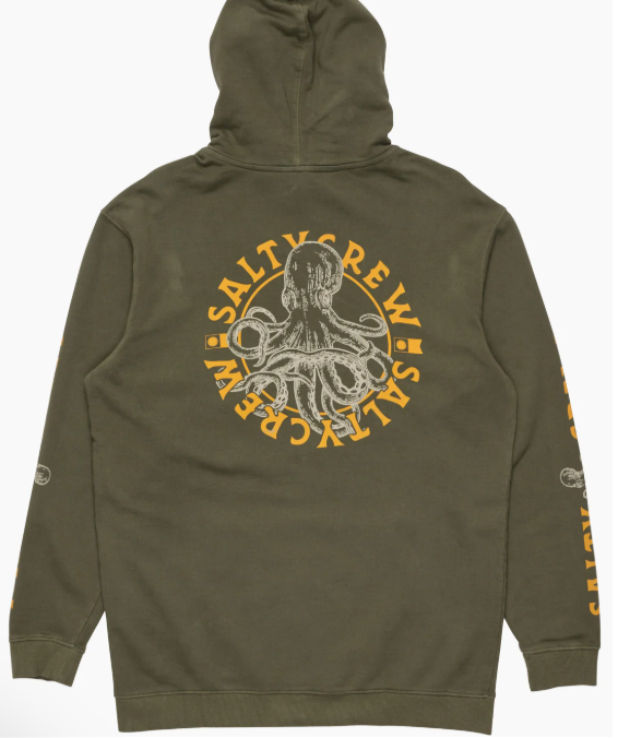 Ichiban Hood in Dusty Olive is made from our signature mid-weight Cotton/Polyester Brushed Fleece, 380gsm in weight. Featuring two-piece hood with encased drawcord, rib knit cuffs & hem, self-fabric kanga pocket & Salty Crew clamp label at hood opening. Screen Printed front and back prints.