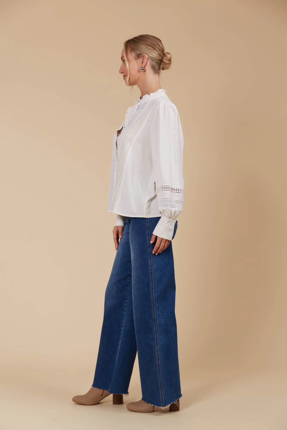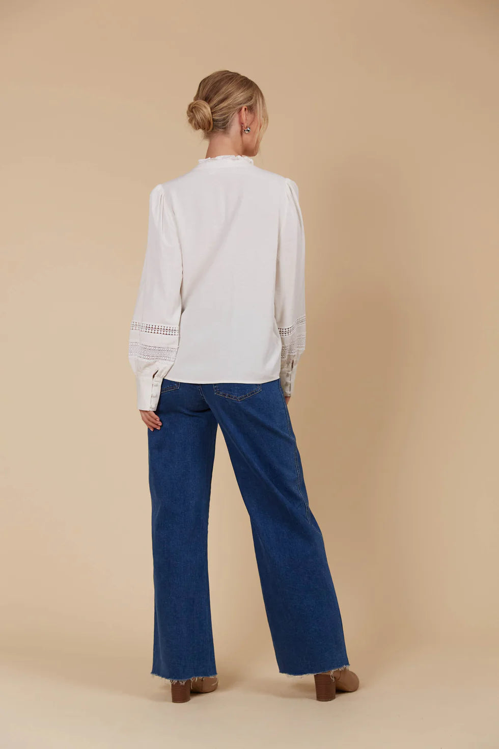 - Bishop sleeves with button cuff