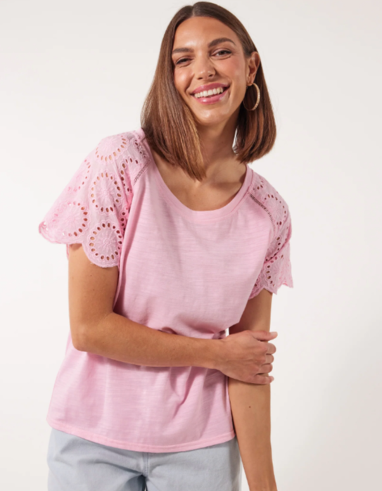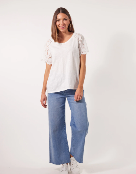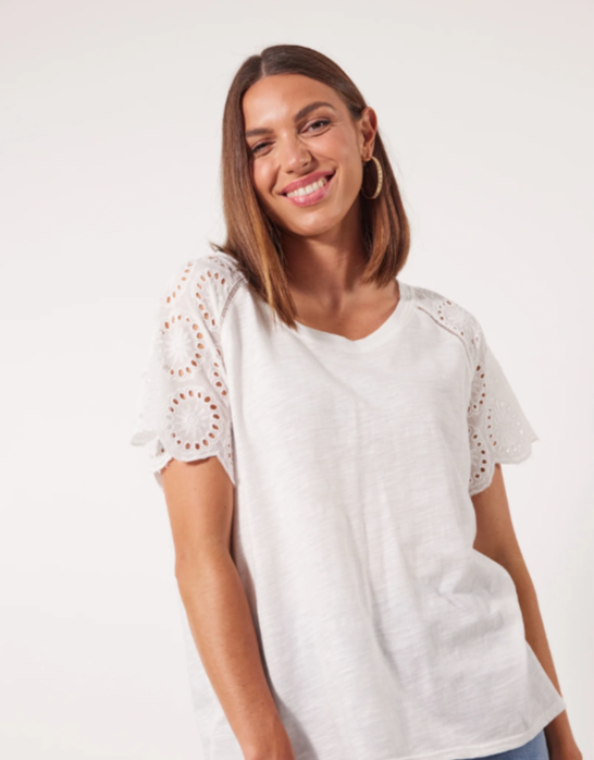 Elevate your natural style with the Parterre Tshirt, crafted with lightweight cotton fabric. The broderie raglan sleeves and scalloped edge bring a touch of feminine elegance to your ensemble. Style it for a leisurely lunch with friends by pairing it with a maxi skirt, sandals, and simple accessories.