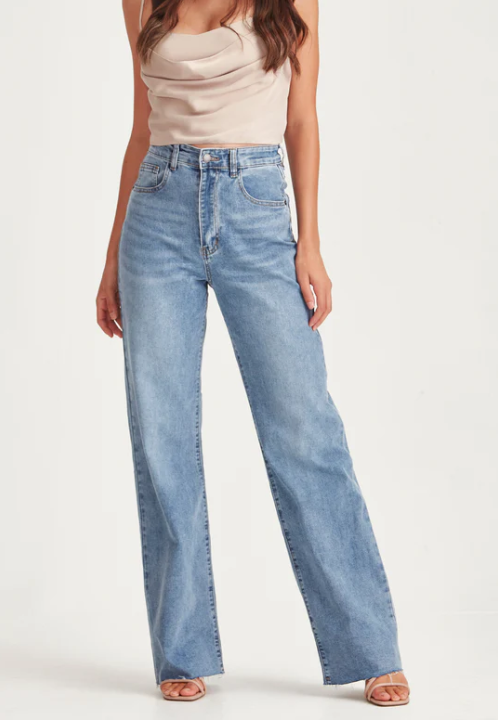 High waisted stretch denim straight to wide leg jean. Antigoni is a relaxed fit and super comfy jean in a soft stretch denim, slimmer fit to the waist/body and with a baggier fit leg and raw hem that can be cut to length to suit.We love it..