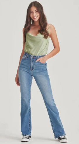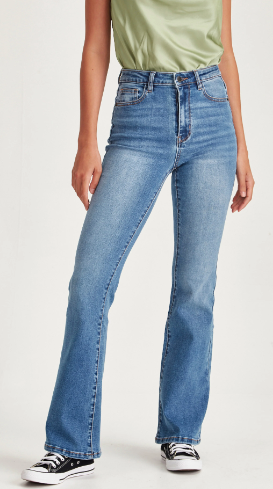 A classic flared jean in a soft stretch denim with a slim fit through the waist and thighs.
