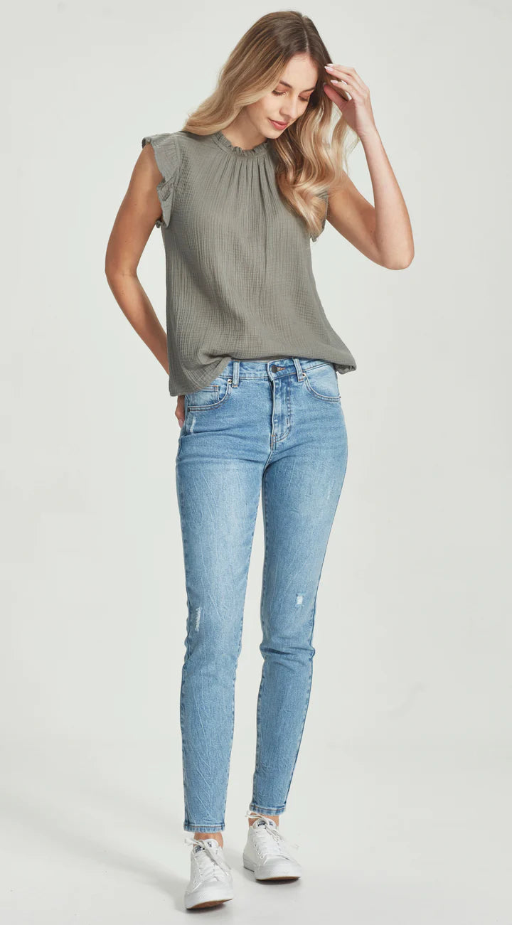Mid waisted straight leg tall jean.
