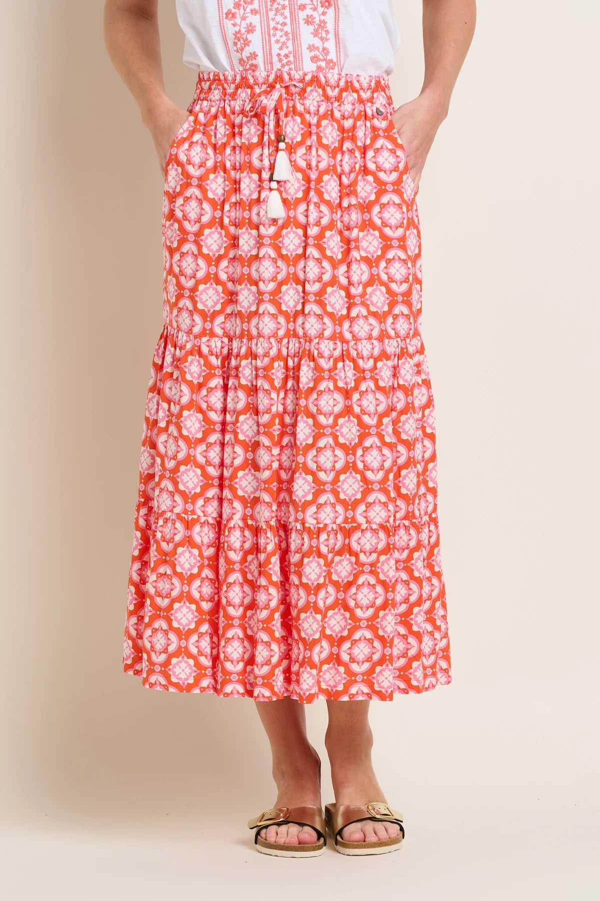 Tiered maxi skirts are made to move. The Brakeburn Moroccan Tile maxi skirt is vibrant, lightweight and has beaded tassels at its elasticated waist. Wear with a camisole or plain cotton vest with sandals at the beach or for laidback evenings out.