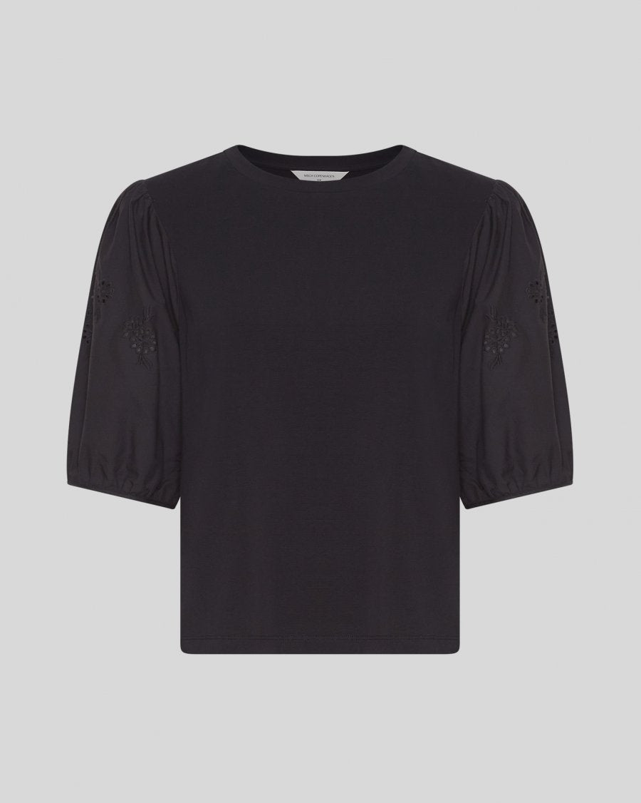 The Cebrina top is a jersey top, with a round neckline, 2/4 sleeves which have a floral embroidery detail. It's a great everyday top, as it will elevate a simple outfit.