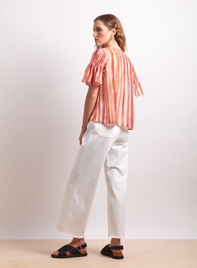 The Draw The Line Blouse is a striped short-sleeve shirt with button front and crew neck. A loose fit and subtle flared sleeve with pintuck pleats on the shoulder. Made in a beautiful Tencel, Nylon, Linen blend fabric