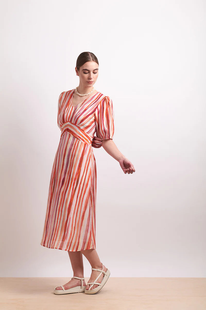 A relaxed midi with a flattering empire waist, the Draw The Line Dress is crafted from a fun stripe fabrication with a V neckline, and elbow-length sleeves. The dress cinches at the waist with an elasticated back. Easy to wear and full of character, this one is ready for any occassion. Designed in Christchurch, New Zealand.