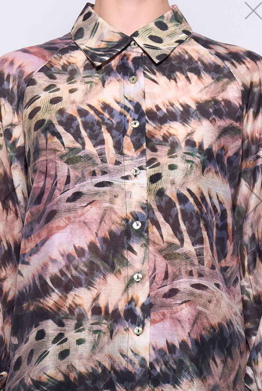 The Fly Girl Shirt by Neris, this semi-sheer shirt has a relaxed, modern silhouette. Crafted from a printed lightweight fabric, it features a button-up front, button cuffs, with mother-of-pearl buttons and a box pleat at the back for a loose, comfortable fit. Designed in Christchurch, New Zealand.