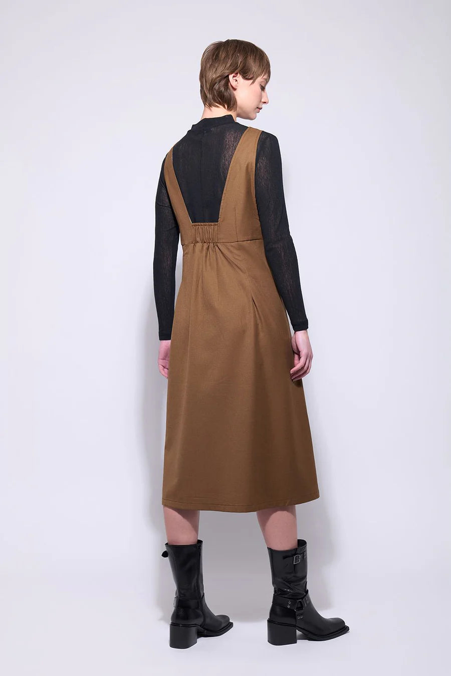 The Hepburn Pinafore by Neris, a contemporary take on the classic pinafore, this mid-length dress is made from a wool-blend fabrication. Featuring a flattering V-neckline, pleated skirt, and an elasticated back for comfort, it also includes side pockets. Designed in Christchurch, New Zealand.