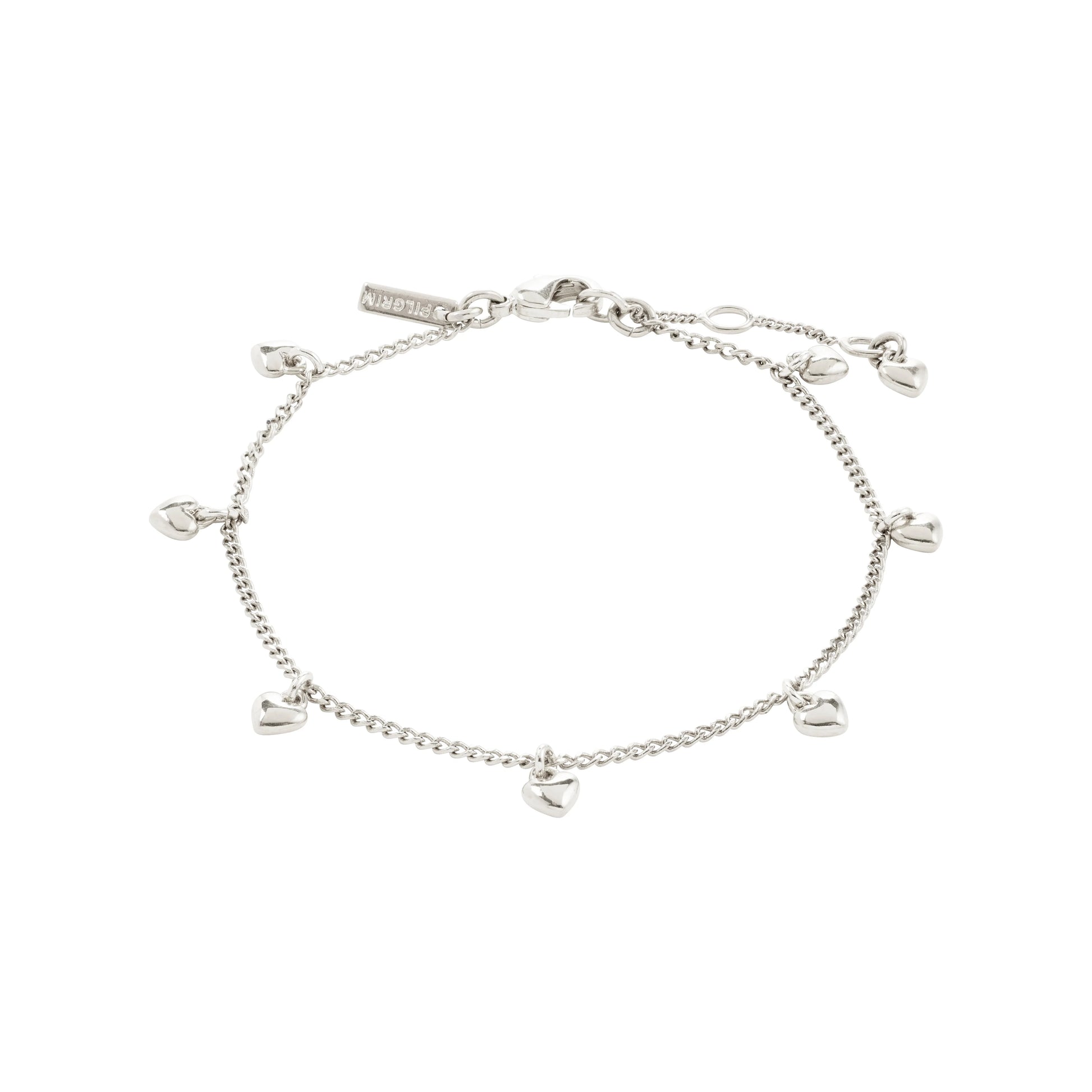 All about love! Slim plated curb chain bracelet with eight tiny heart pendants creating a cute romantic look. The small hearts add a playful touch to your look, making the bracelet perfect for both daily wear and special occasions. Wear it alone for a delicate statement or pair it with additional bracelets for a trendy stacked style. Your go-to accessory for effortless romance! Made from 99% recycled materials with love for the planet.
