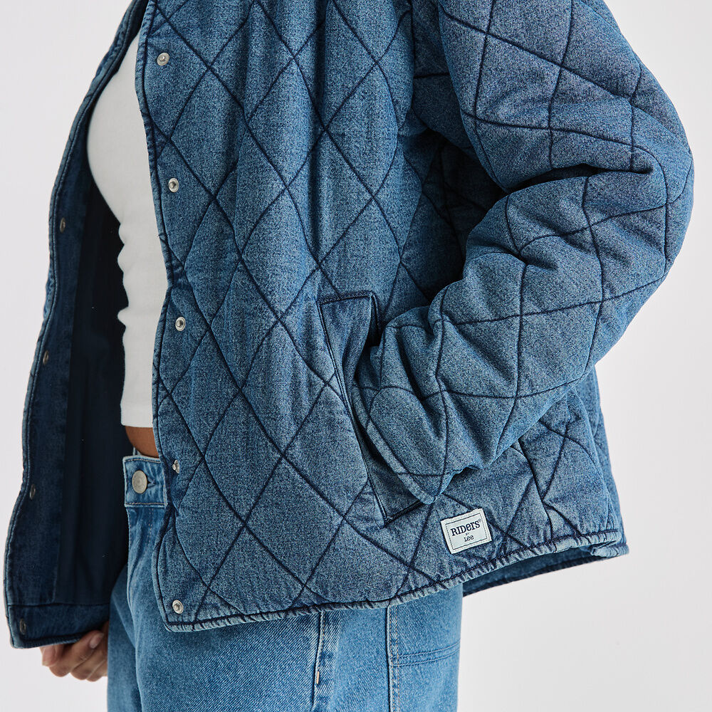 The Denim Quilted Bomber will have you covered for the cooler months. Designed to fit relaxed and boxy, with a high neck collar. The outer layer is crafted in a quilted denim, and features side hip pockets and snap buttons at the front.