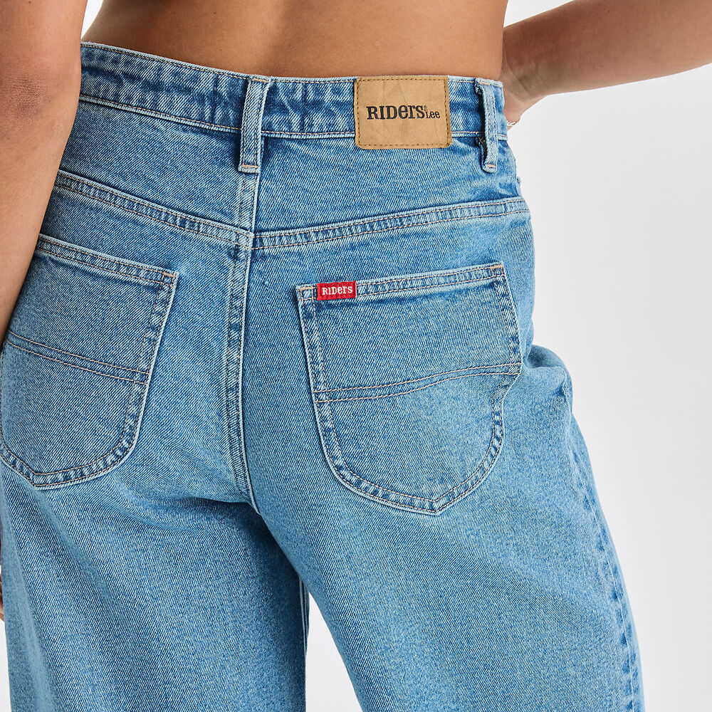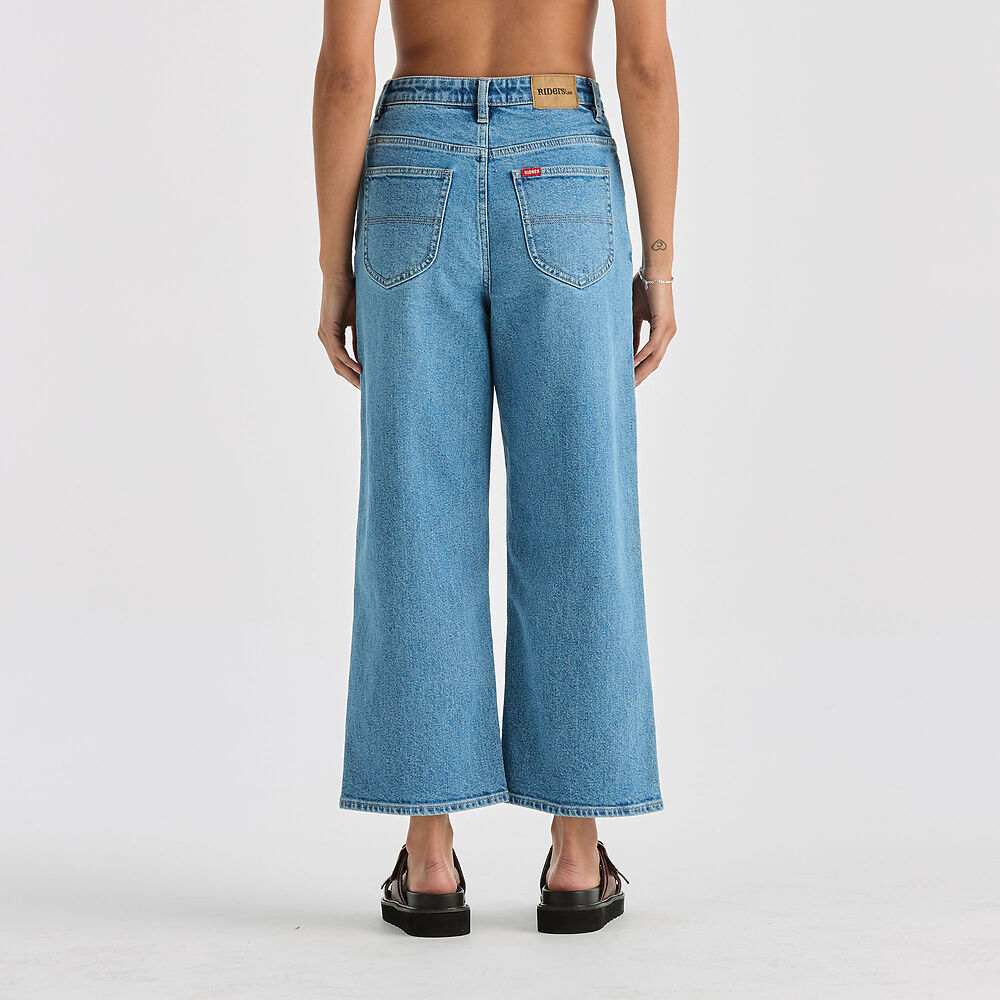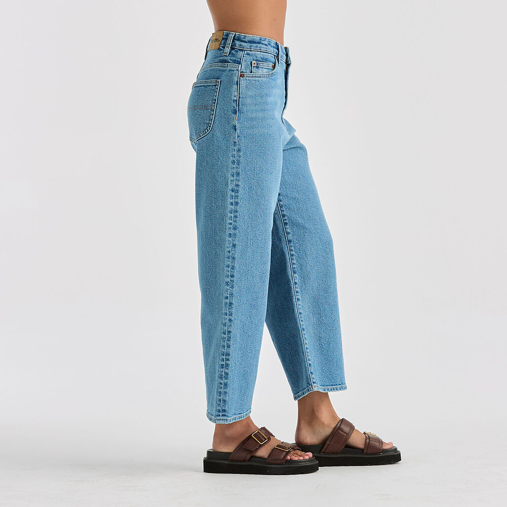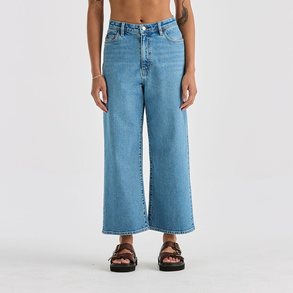 The Hi Wide Crop sits high and snug on the waist with a dramatic A-line leg silhouette that anchors seamlessly off your hips, cropped to finish above the ankle. Crafted in a vintage inspired, mid indigo wash that offers the look of vintage denim with the comfort of hidden stretch.