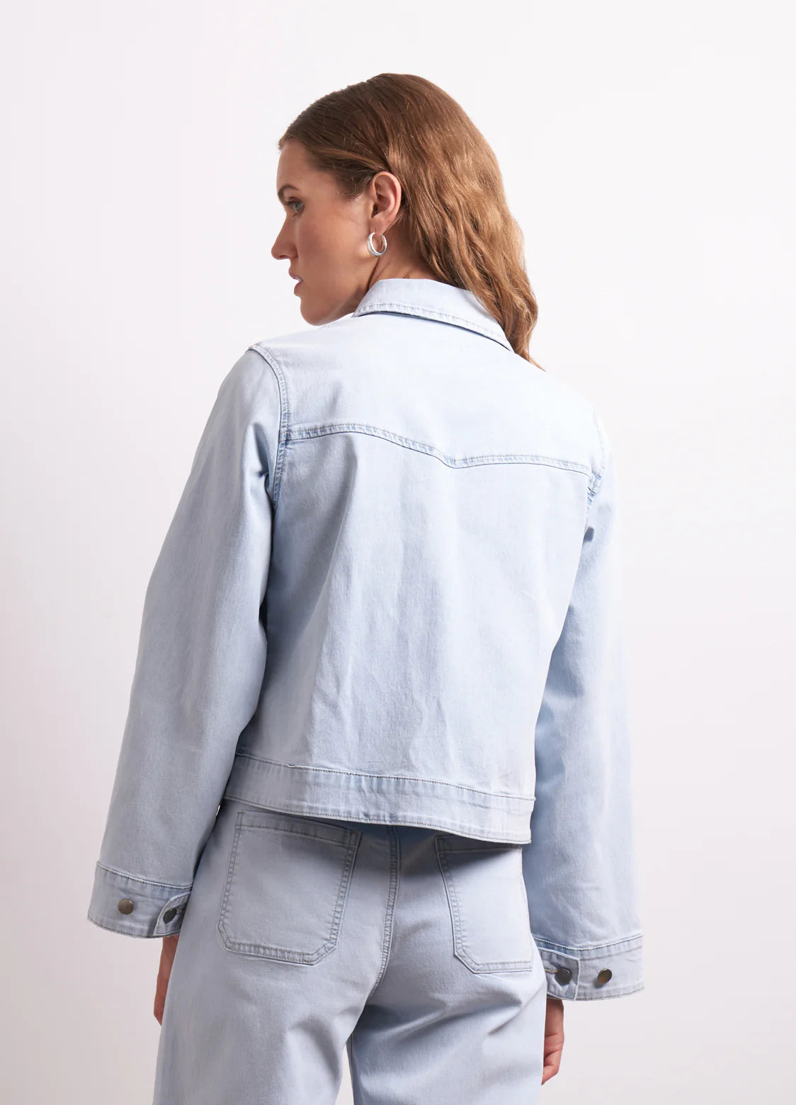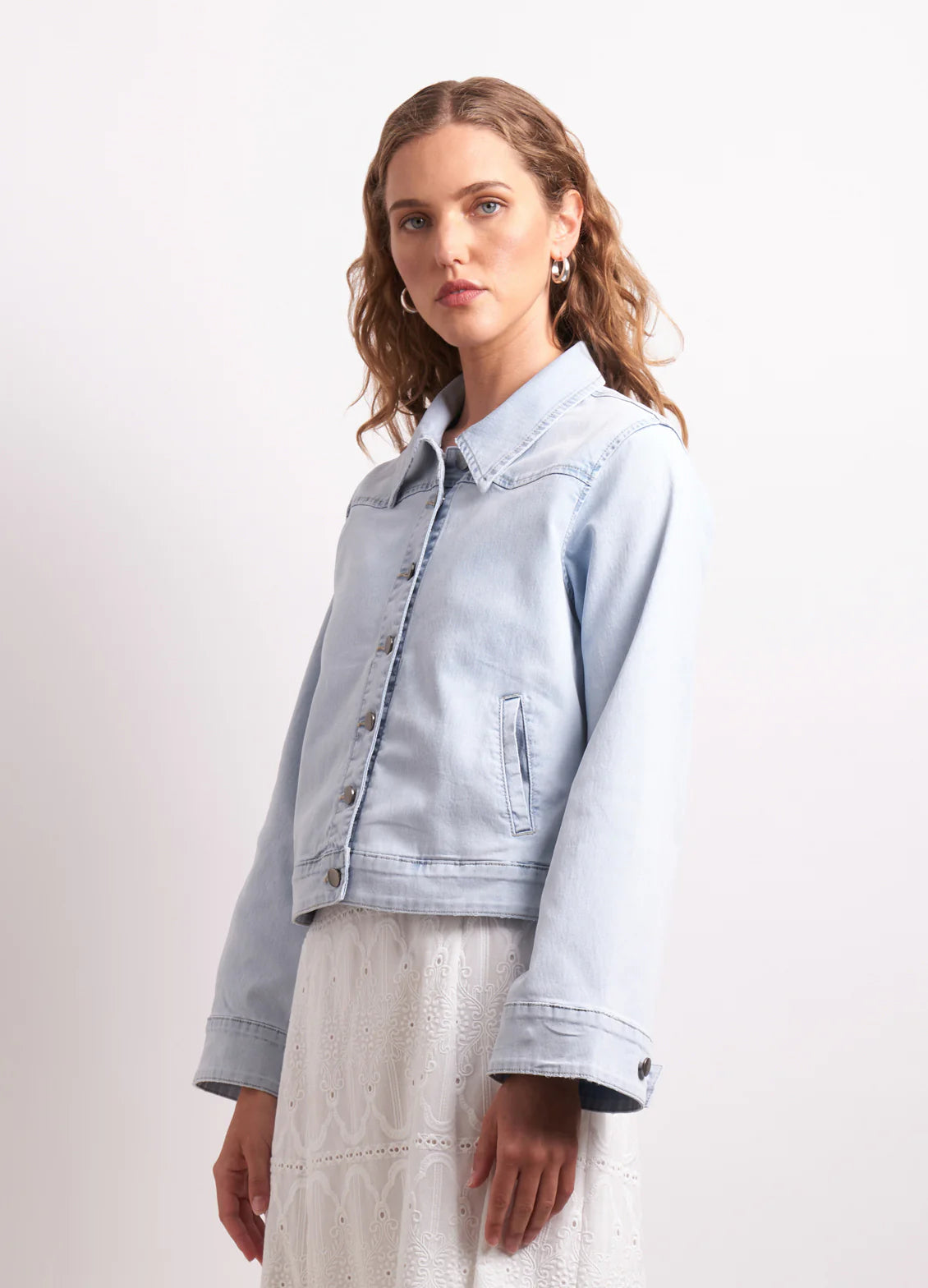 The Go West Jacket puts a playful spin on the classic denim layer. It is a relaxed fit, crafted from a lightweight soft fabrication with stretch, and has statement bell sleeves. The jacket features a western-inspired yoke, front button closure, and practical side pockets. A polished yet easy-going denim jacket that nods to vintage.