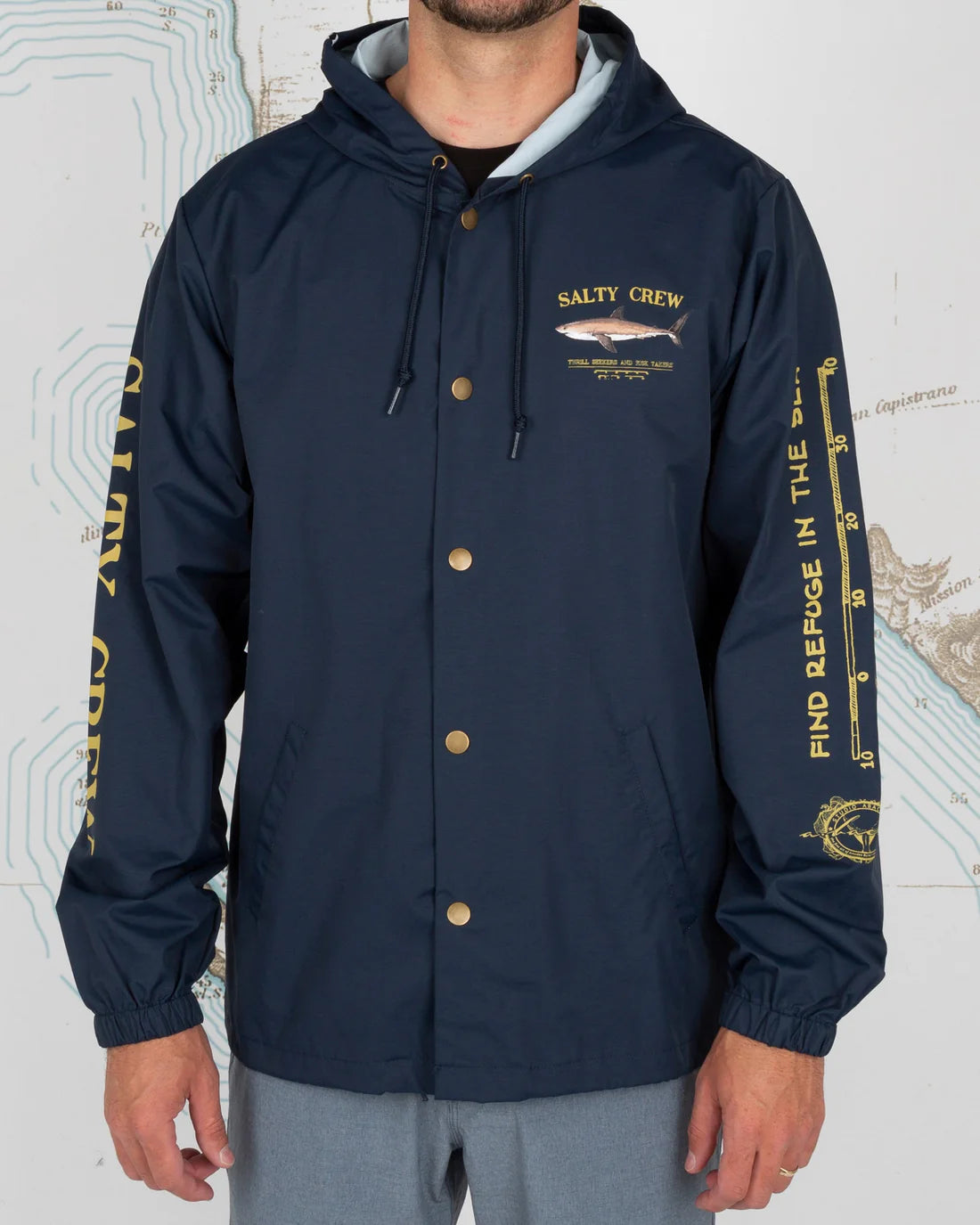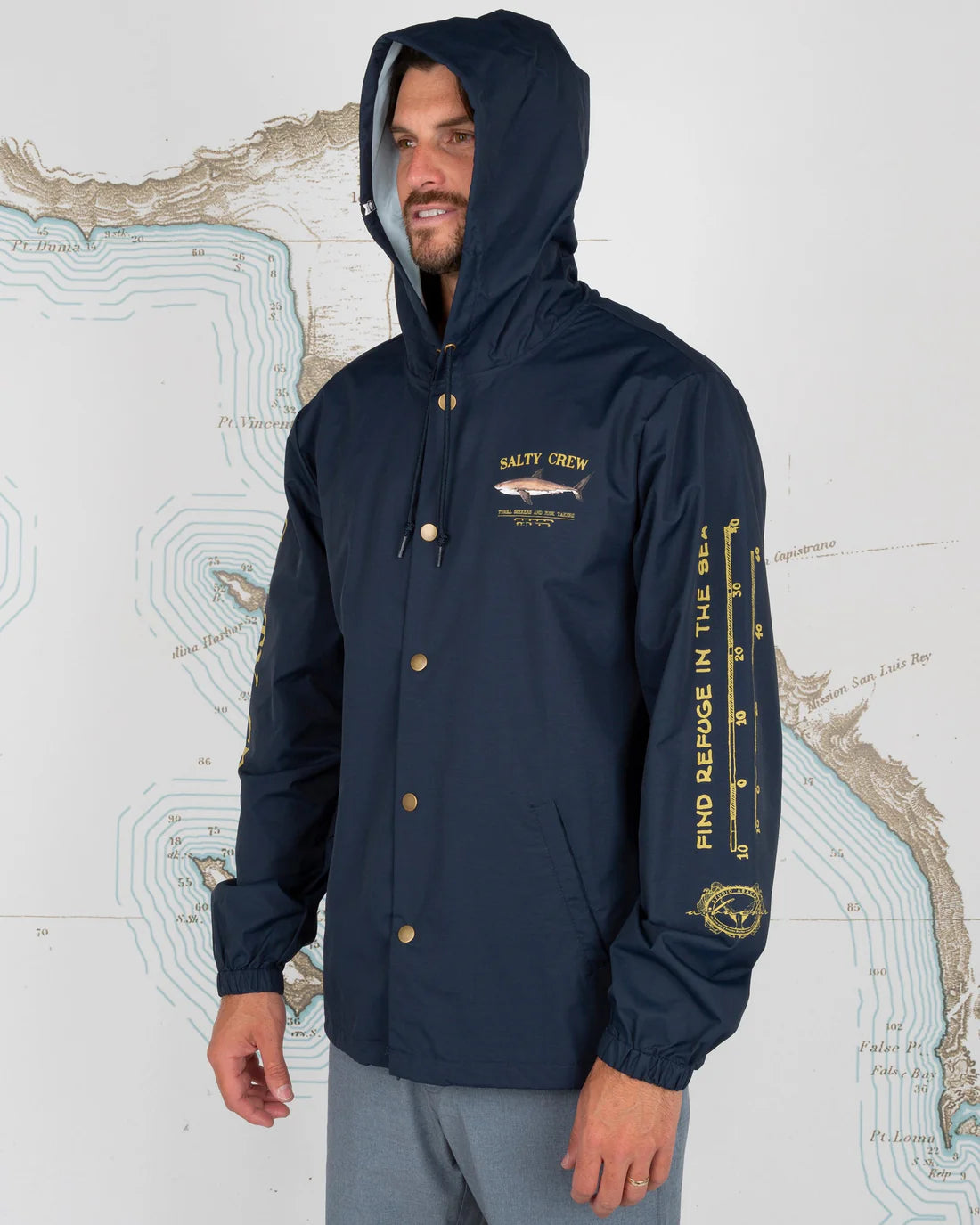 Bruce Snap Jacket in Navy. Heavyweight 10K Waterproof/5K breathable snap jacket. Featuring drawcord hood and custom Salty Crew Bruce screen print on front, back and sleeves.