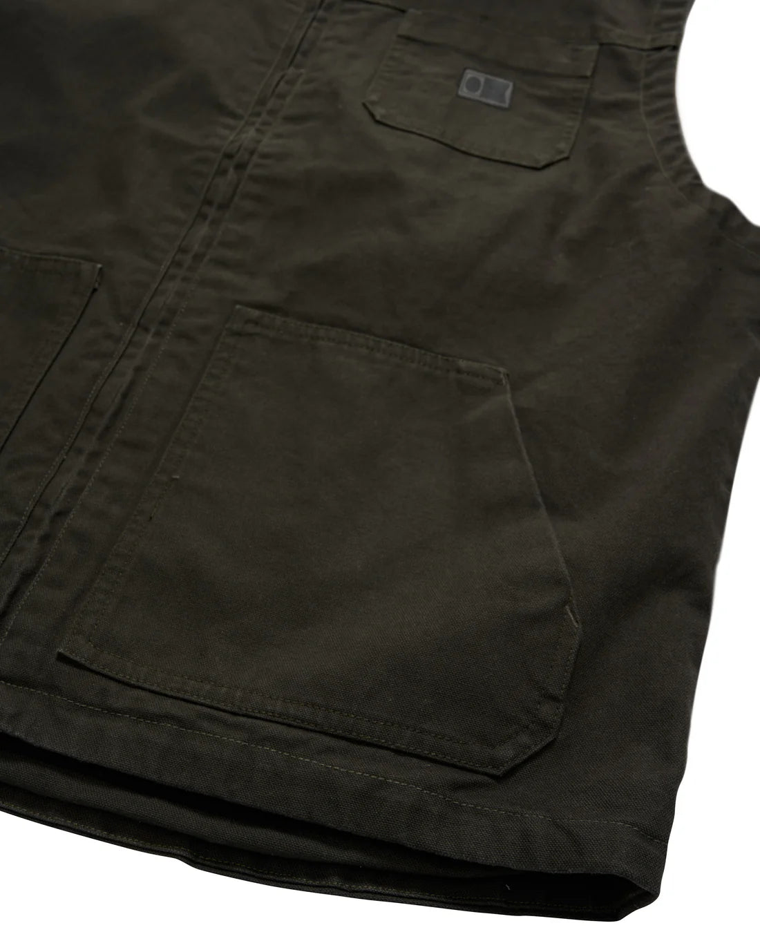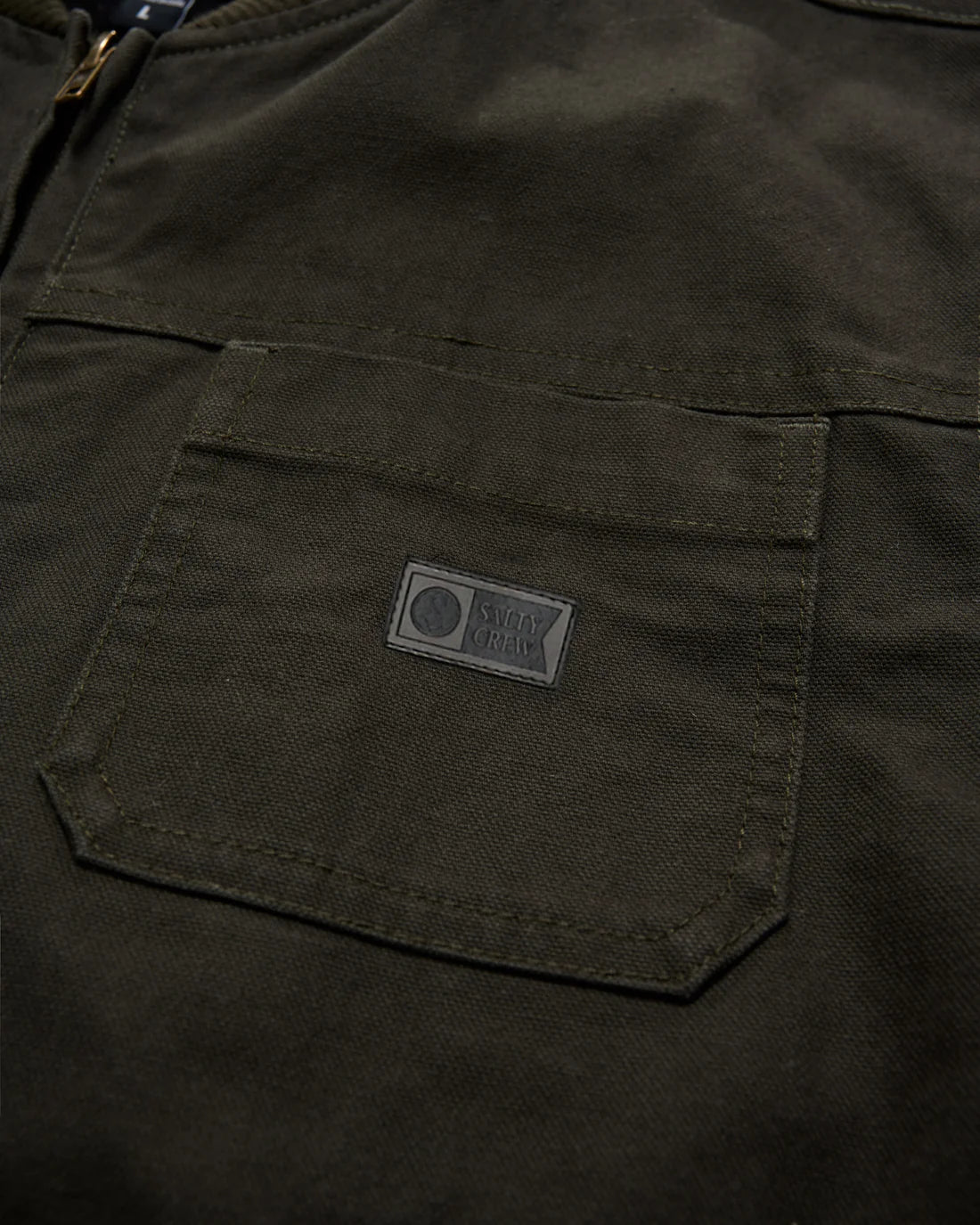 The Captain Vest in Coal is made from 100% cotton canvas with a 100% cotton flannel lining in the body. Pigment garment dyed and enzyme washed for a soft, worn-in feel. It features a chest pocket, patch pockets at the hips, and a rib-knit collar for added comfort. The metal zipper closure at the center front and a curved hem at the back enhance its design. Finished with a faux leather Salty Crew patch at the left chest for a stylish touch.