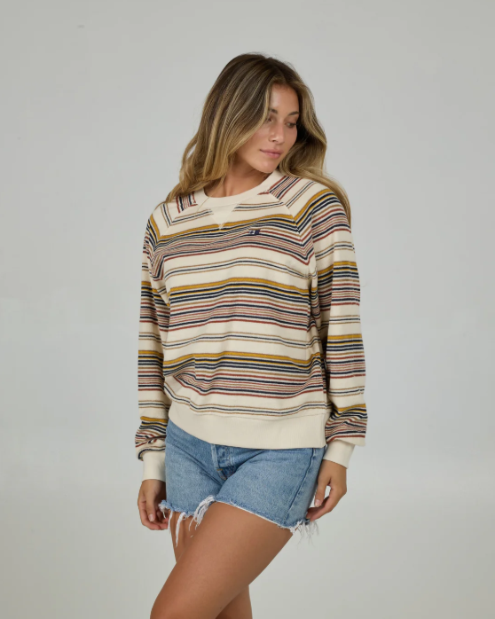The Gone Sailin Fleece Crew is a crew neck, pullover-style sweater made from cotton/polyester French terry in a yarndyed stripe design. It features a rib knit neckband, set-in "V" detail at the front neckline, ribbed cuffs and hem, and is finished with embroidered artwork at the left chest.