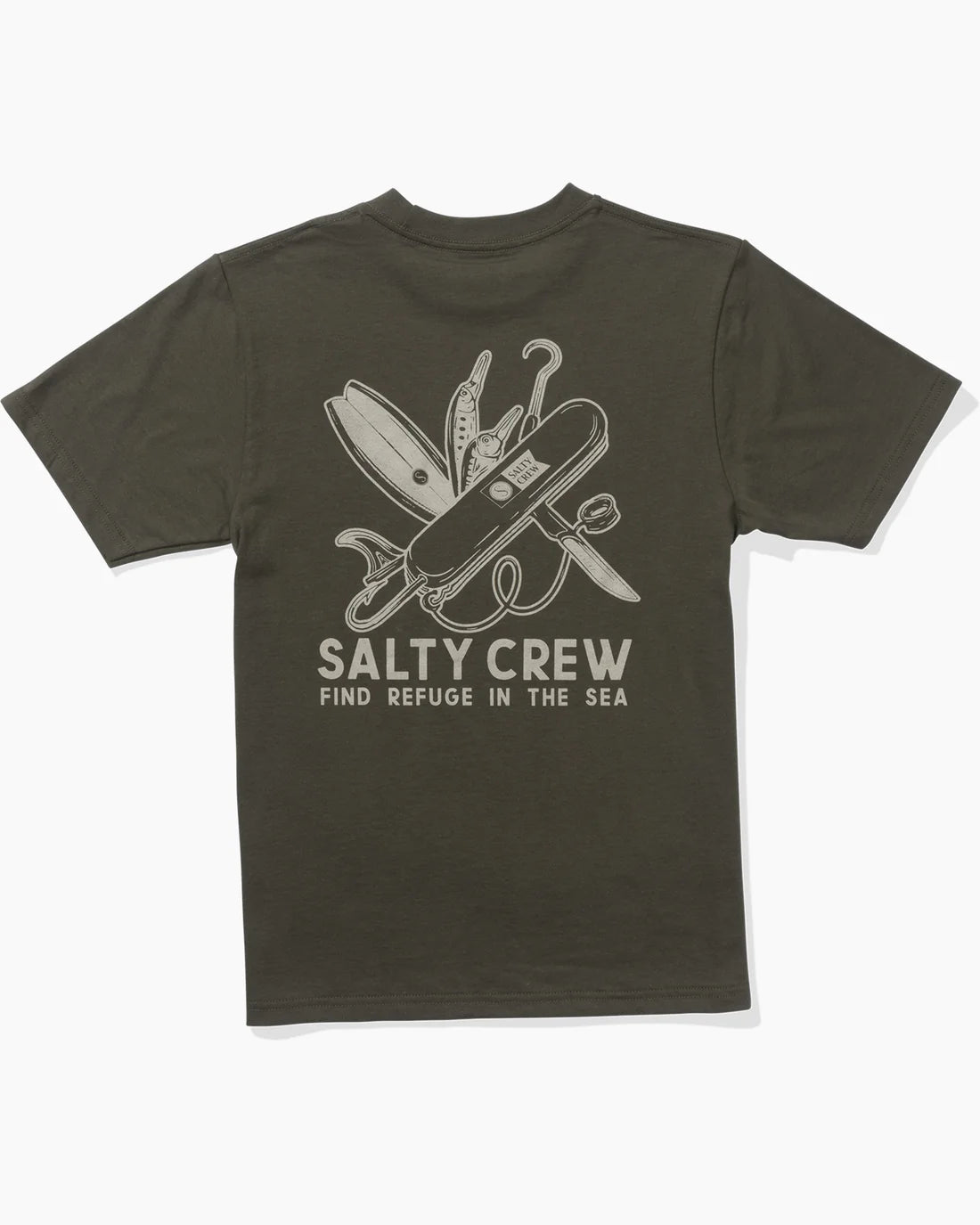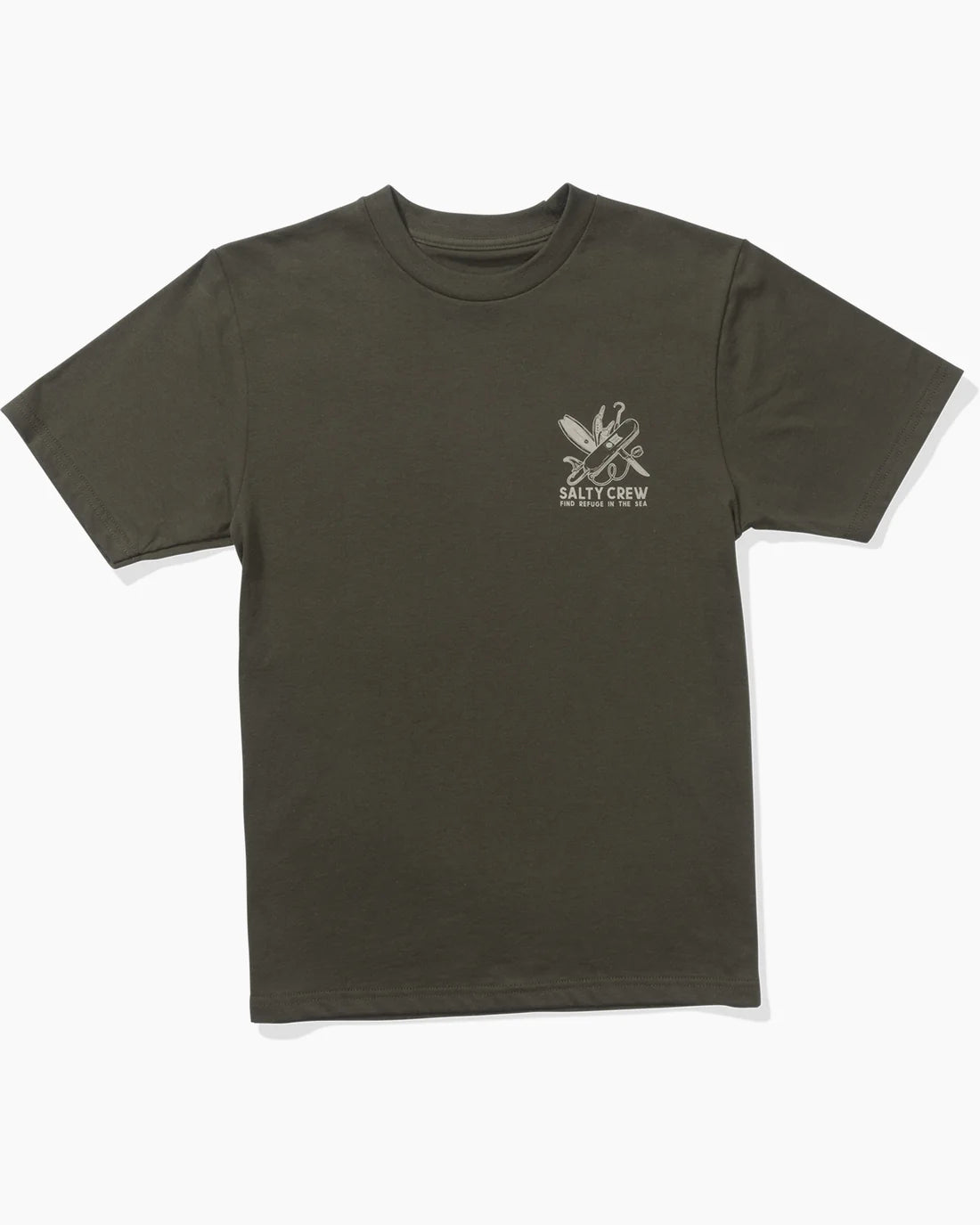 The Pocket Knife Boys SS Tee in Dusty Olive is made from soft spun cotton jersey, offering a comfortable 180gsm weight. It features a Salty Crew clamp label at the sleeve hem and bold screen-printed designs on both the front and back, providing a cool, casual look.