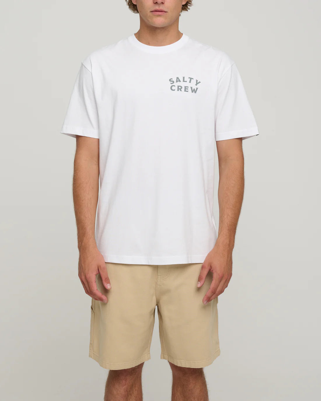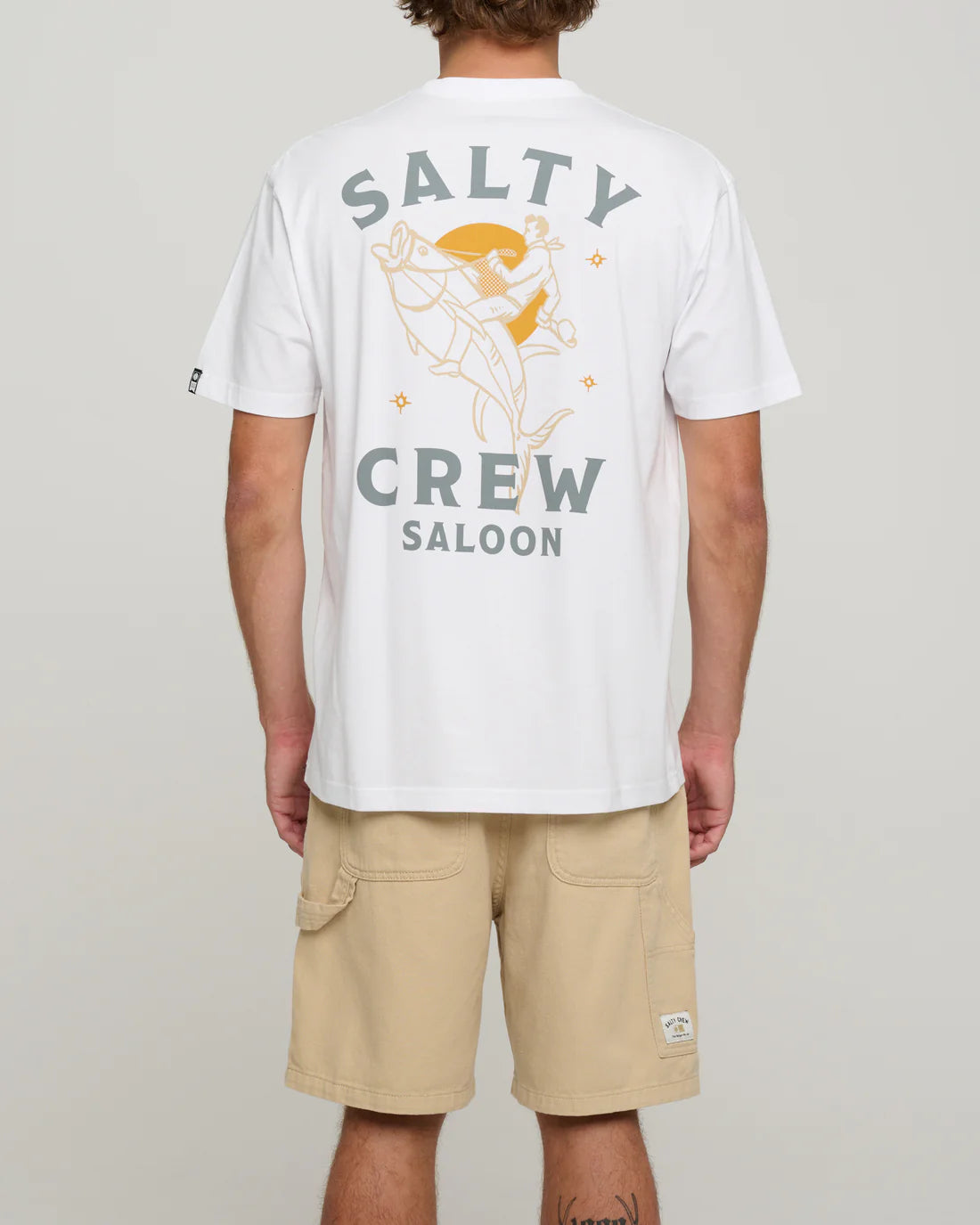 The Saloon Premium SS Tee in White is crafted from our signature combed cotton jersey, featuring a lightweight 180gsm feel. It includes a Salty Crew clamp label at the sleeve hem and showcases bold screen-printed designs on both the front and back, making it a stylish addition to any wardrobe.