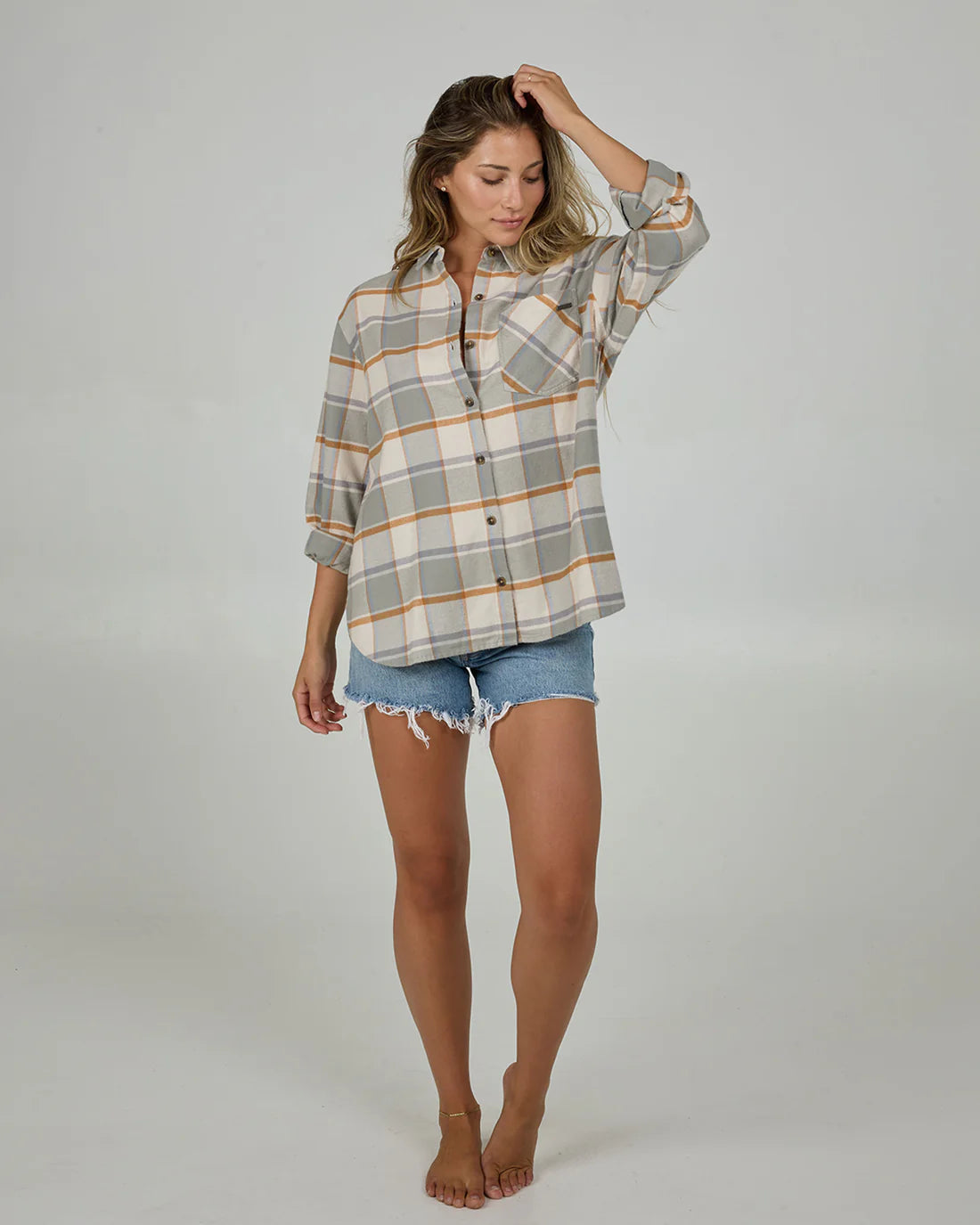 The Shore Break Flannel Shirt in Clay Grey is an oversized long sleeve button-up flannel shirt made from midweight 100% cotton yarn-dyed check flannel twill. It features a two-piece collar and branded resin buttons.