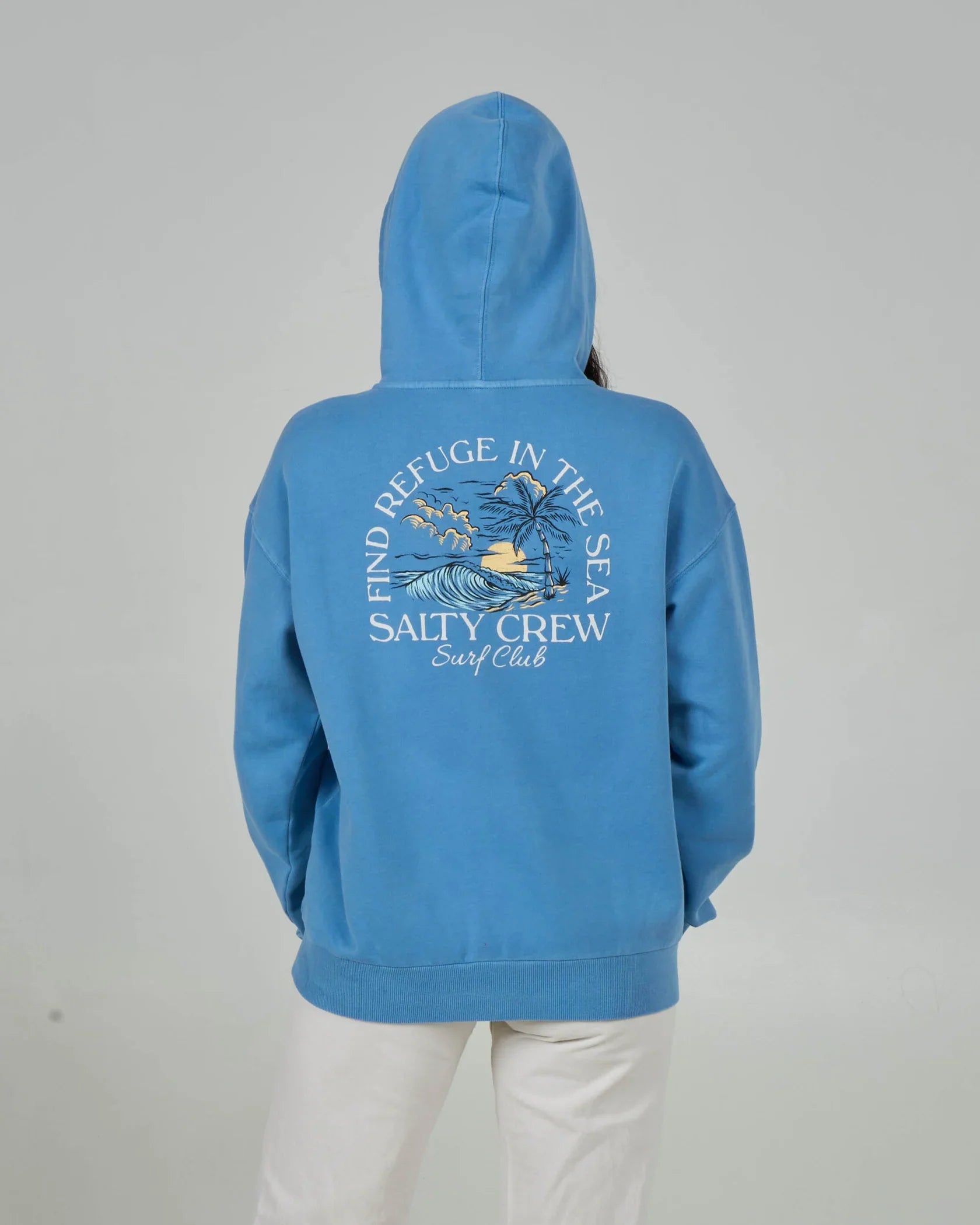 The Surf Club Zip Through Fleece Hoody in Marine Blue is an oversized hoody with a kangaroo pocket and two-piece hood. It features screen printed graphics on the chest and back.