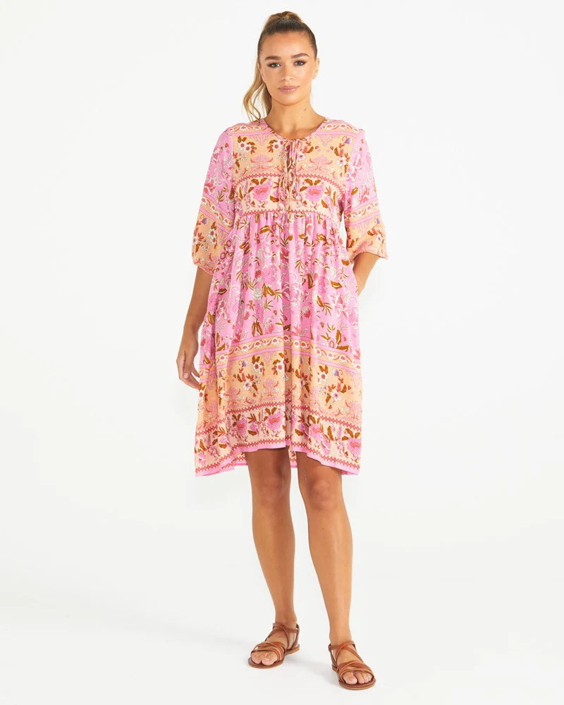The Chiara Dress features a tiered skirt and a keyhole neck tie, offering a relaxed, elevated look perfect for springtime. Made from soft drapey fabric, it's an ideal choice for comfortable everyday wear.