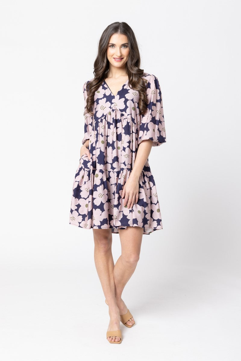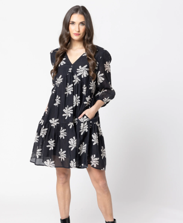 This mini V-neck dress features a flattering empire line that accentuates your silhouette, while the 3/4 sleeves with elastic cuffs add a touch of sophistication and comfort. The back keyhole detail provides a subtle hint of allure, making it perfect for both casual outings and more formal events. Practicality meets style with convenient side seam pockets, allowing you to keep your essentials close at hand. Lined for added comfort and quality, this dress pairs beautifully with black boots for a chic, modern look.