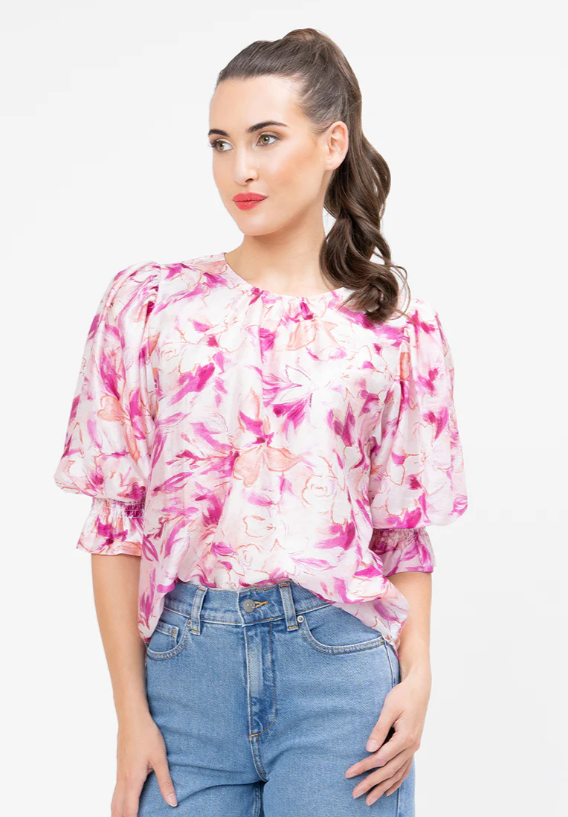 Crafted with meticulous attention to detail, this blouse features a charming pink and tangerine floral splash print that adds a pop of colour to any outfit. The 3/4 sleeves are adorned with shirring detail and a delicate frill at the cuff, creating a sophisticated silhouette that flatters the arms. The round neck design is complemented by a back neck keyhole detail, enhancing the overall allure of the blouse.