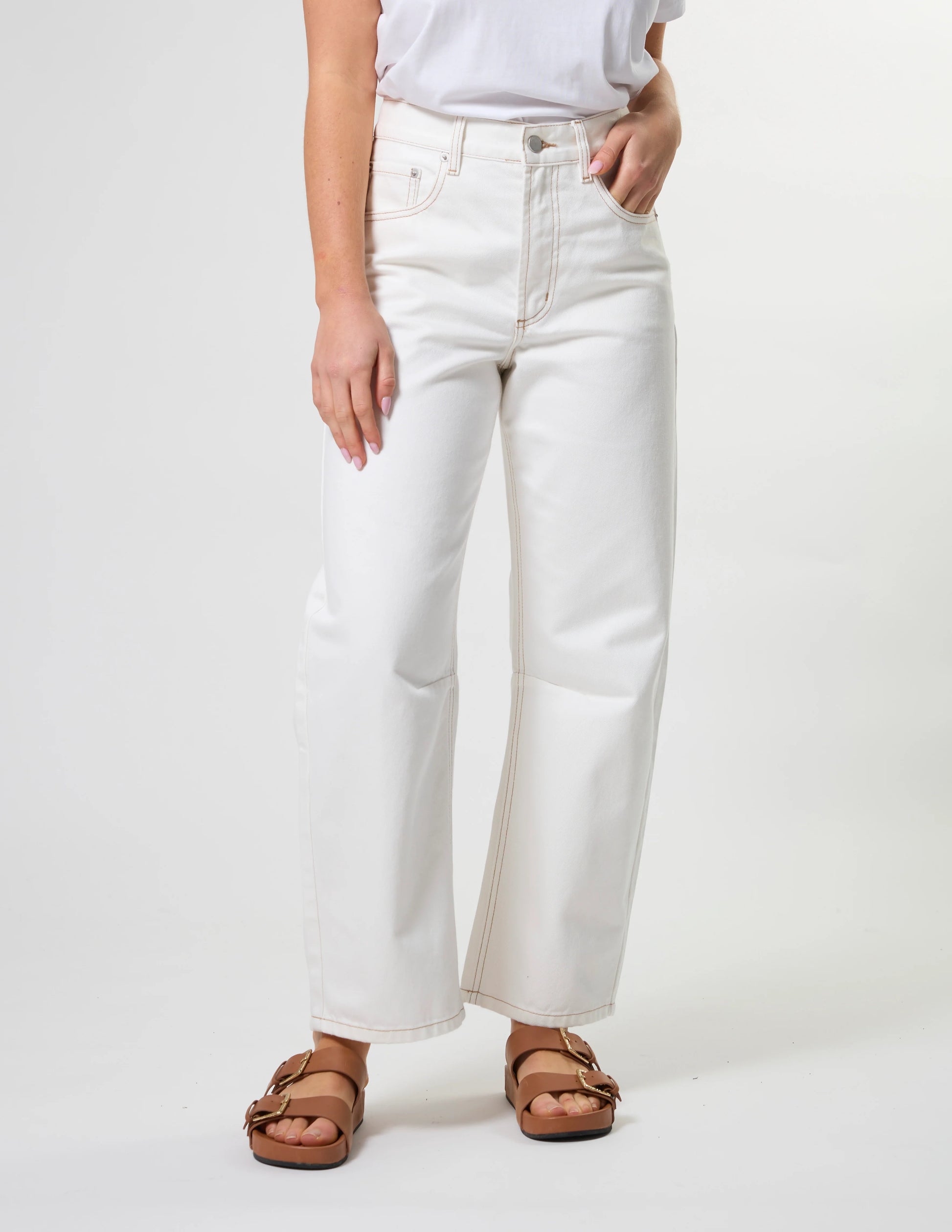 Ankle length barrel leg jean with zip fly and inner knee seam tuck detail. Back waist logo patch.
