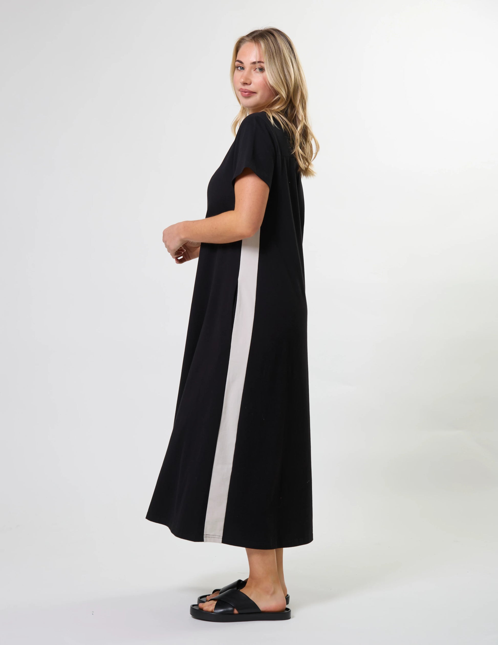 Midi length jersey knit crew neck t-shirt dress with contrast side panel insert. Slight A line shaping through the body