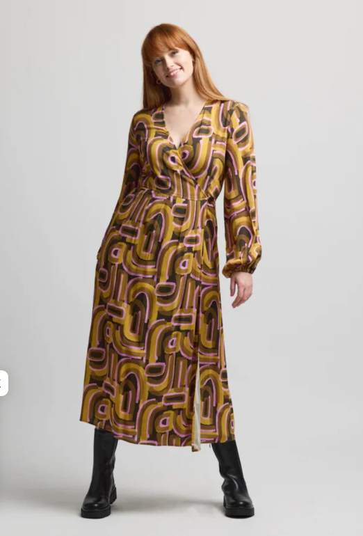 V Neck wrap maxi dress with waist button fastening and pleats and narrow width tie belt