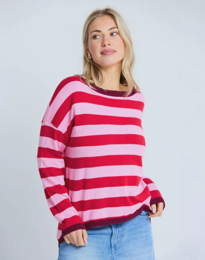 Striped lightweight jersey knit with contrast colour trims. Crew neck , dropped shoulder and slightly hi lo hemline.