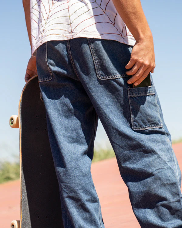 Volcom's rugged, garment-washed denim in a loose tapered fit, crafted from sustainable materials for skate-ready style and broken-in comfort.