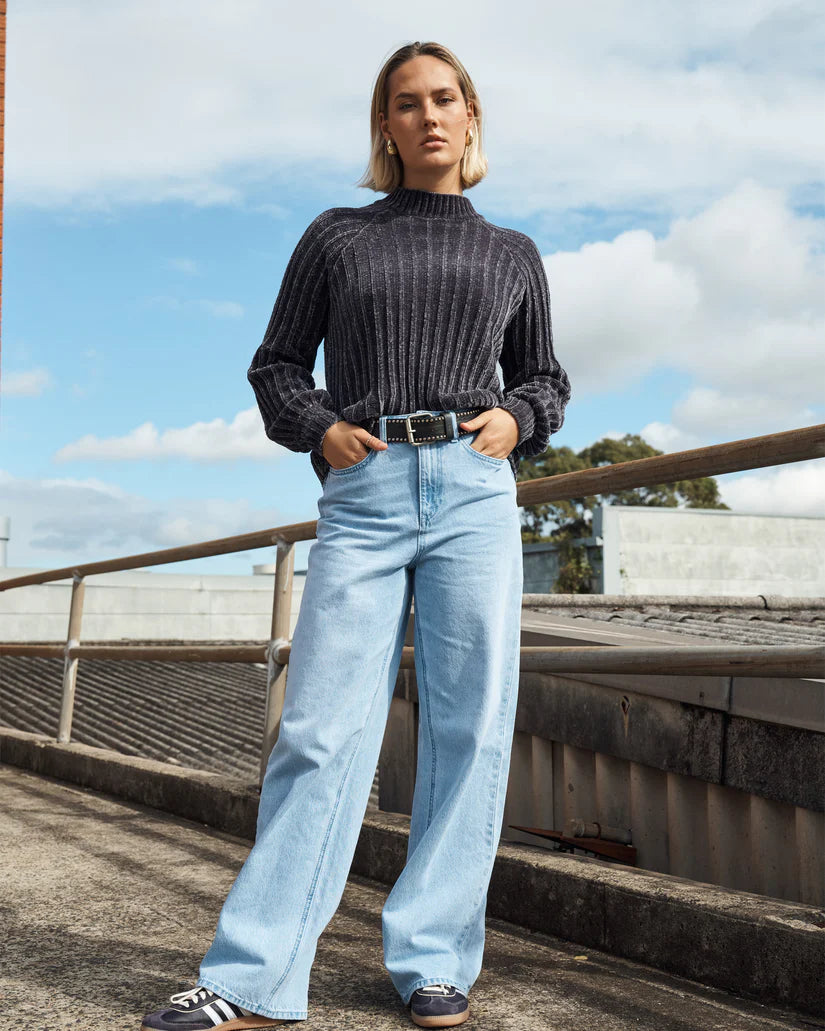 Embrace your inner savage with this cozy mock neck sweater. Crafted from soft polyester chenille, it offers a relaxed fit with stylish raglan sleeves and blouson cuffs. The metal badge at the waistband adds a touch of edge to this casual-chic piece. Perfect for those who want comfort without sacrificing style. Featured here in dark grey.