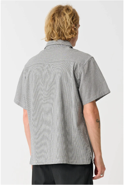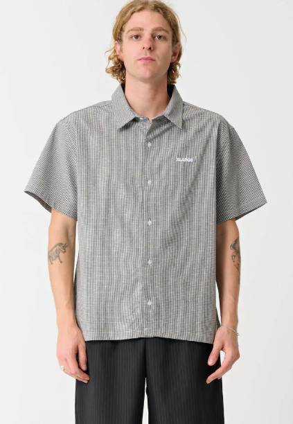 The 91 Oxford Shirt in Grey is an oversized box-fit traditional short sleeve shirt.