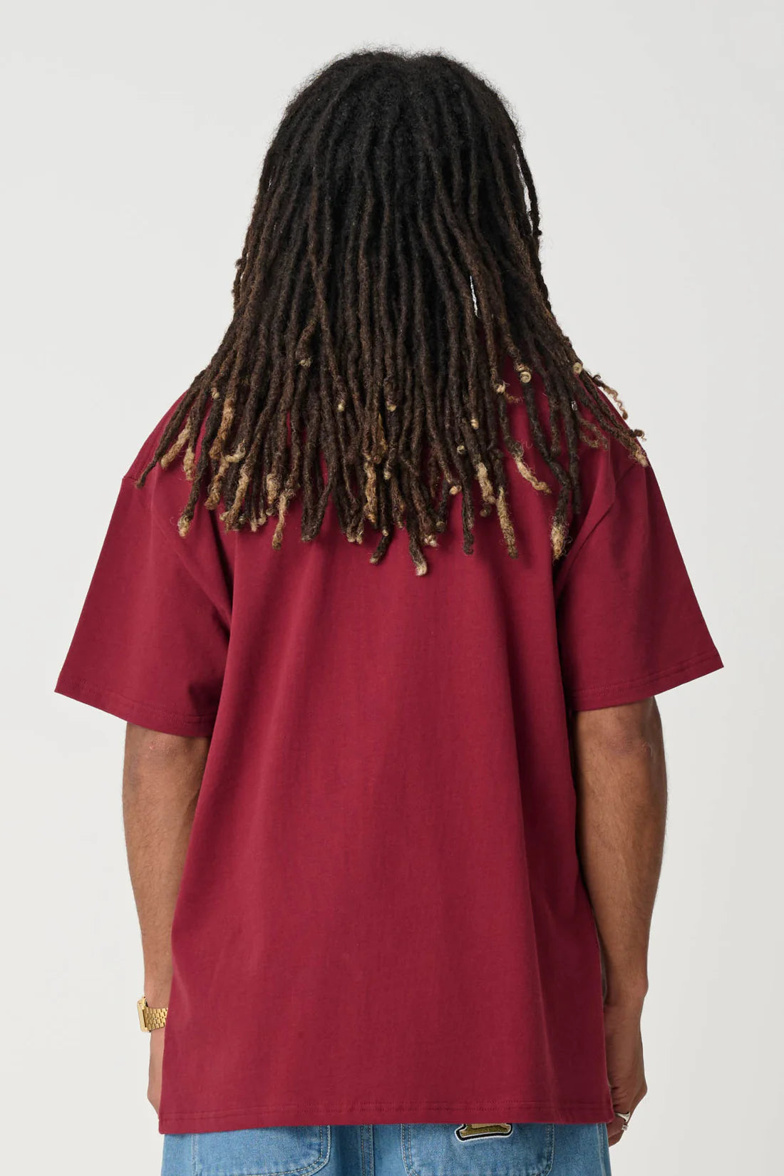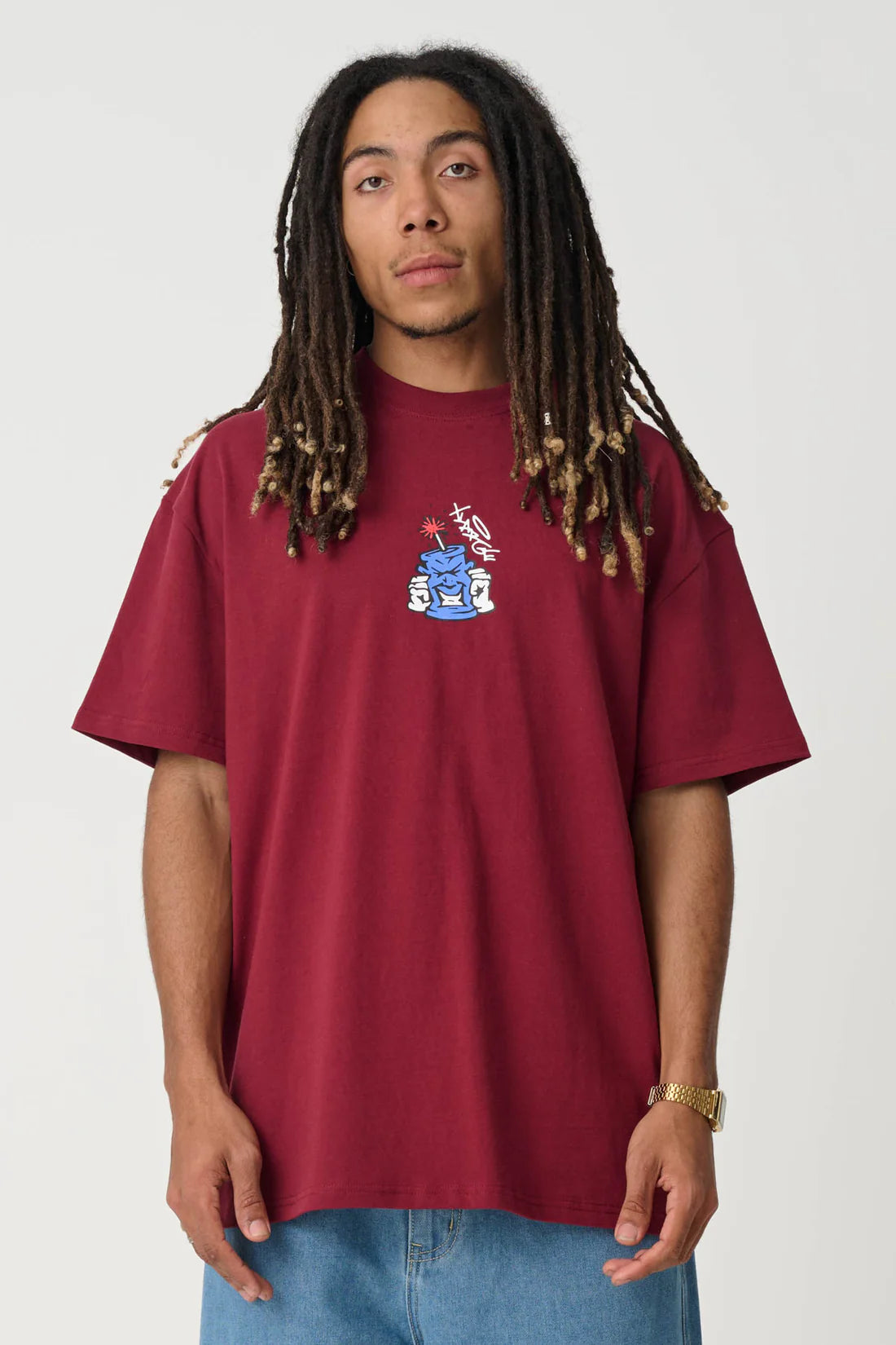 The Dynamite shortsleeve crewneck tee in Burgundy is a custom box-fit, constructed from a combed cotton jersey.